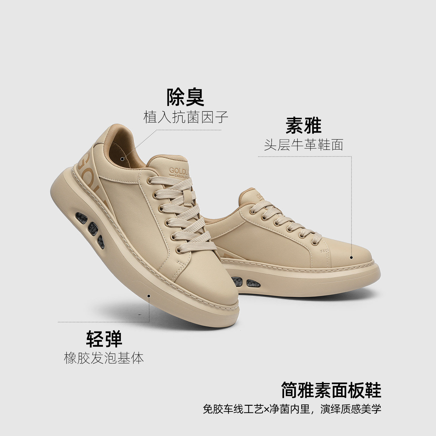 Goldlion男鞋2025年秋季新款男士休闲鞋,融合时尚设计与舒适科技,专为现代都市男性打造。采用优质真皮材质,质感细腻,彰显品味;鞋身简约大方,百搭易穿,轻松驾驭商务休闲与日常出行。搭载轻便缓震科技中底,有效缓解行走压力,提升穿着舒适度;橡胶大底耐磨防滑,抓地力强,适应多种地面环境。整体设计兼顾型格与实用,轻盈透气,久穿不累。无论是通勤、聚会还是周末出游,Goldlion新款板鞋都是型男衣橱的理想之选,诠释从容自信的男士风范。