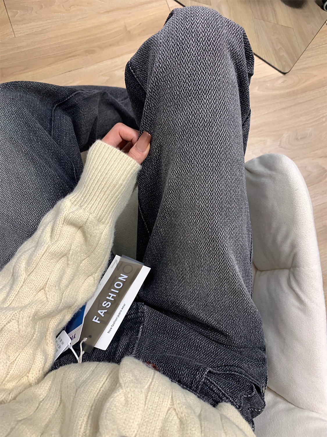 淘宝黑灰色直筒牛仔裤女秋冬新款胖妹妹mm高腰宽松显瘦星空纹阔腿长裤