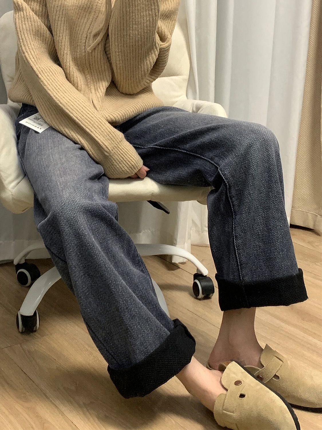 冬季加绒阔腿牛仔裤女2025新款小个子拖地裤子高腰休闲直筒弯刀裤