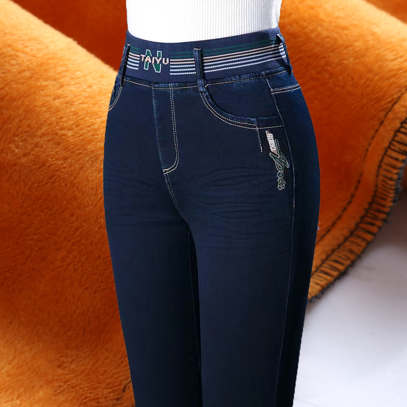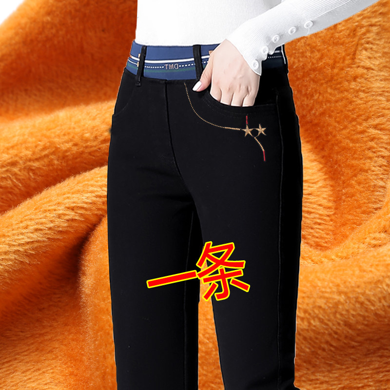 淘宝直筒松紧腰加绒牛仔裤女冬季高腰弹力加厚女裤中年大码保暖裤女棉
