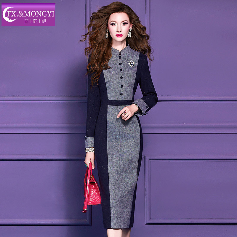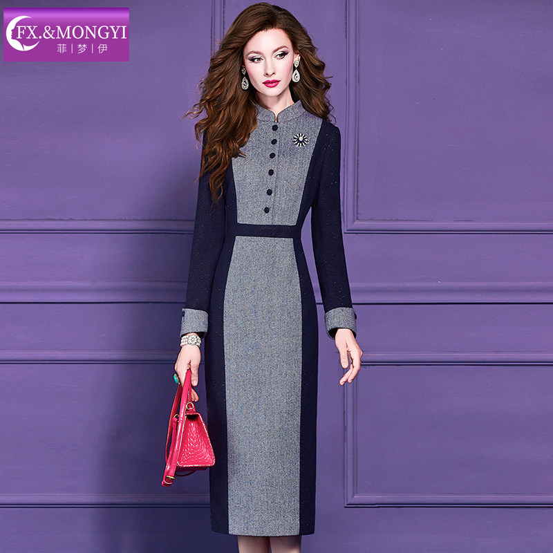 天猫菲梦伊原创含羊毛撞色毛呢连衣裙女冬季复古高端立领修身气质裙子