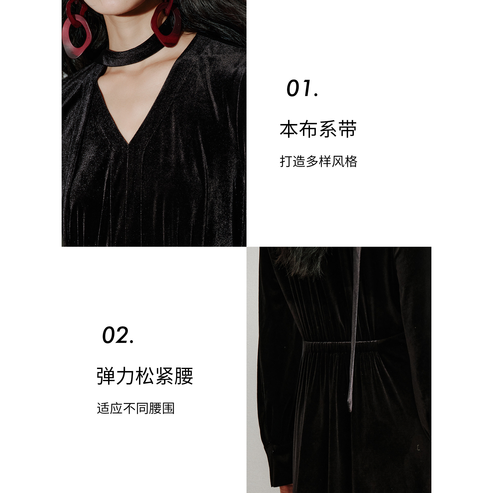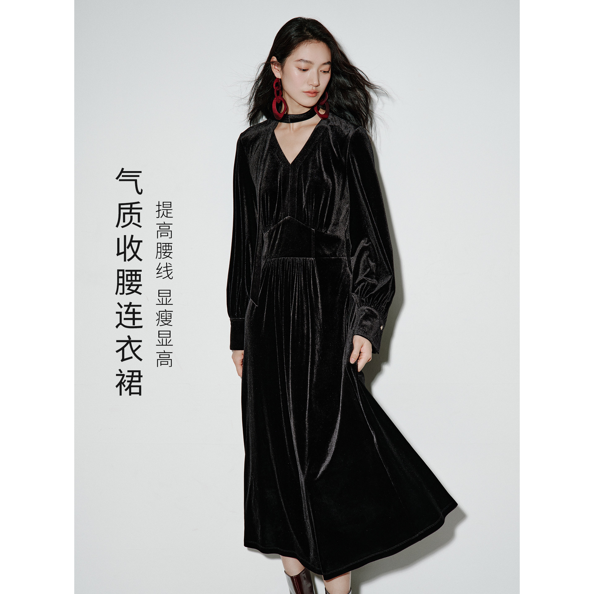 衣香丽影2025年冬装新款黑色飘带丝绒连衣裙,以经典法式赫本风为灵感,融合现代优雅美学。甄选高级丝绒面料,触感柔滑,垂坠感佳,尽显低调奢华。修身剪裁勾勒迷人曲线,V领设计搭配后背飘逸飘带,增添灵动浪漫气息。经典小黑裙廓形,简约而不失细节,适合晚宴、约会或重要场合。内敛光泽与精致走线彰显匠心工艺,诠释 timeless chic。无论是搭配高跟鞋或短靴,皆能展现女性优雅自信气质,是冬日衣橱中不可或缺的时尚单品。