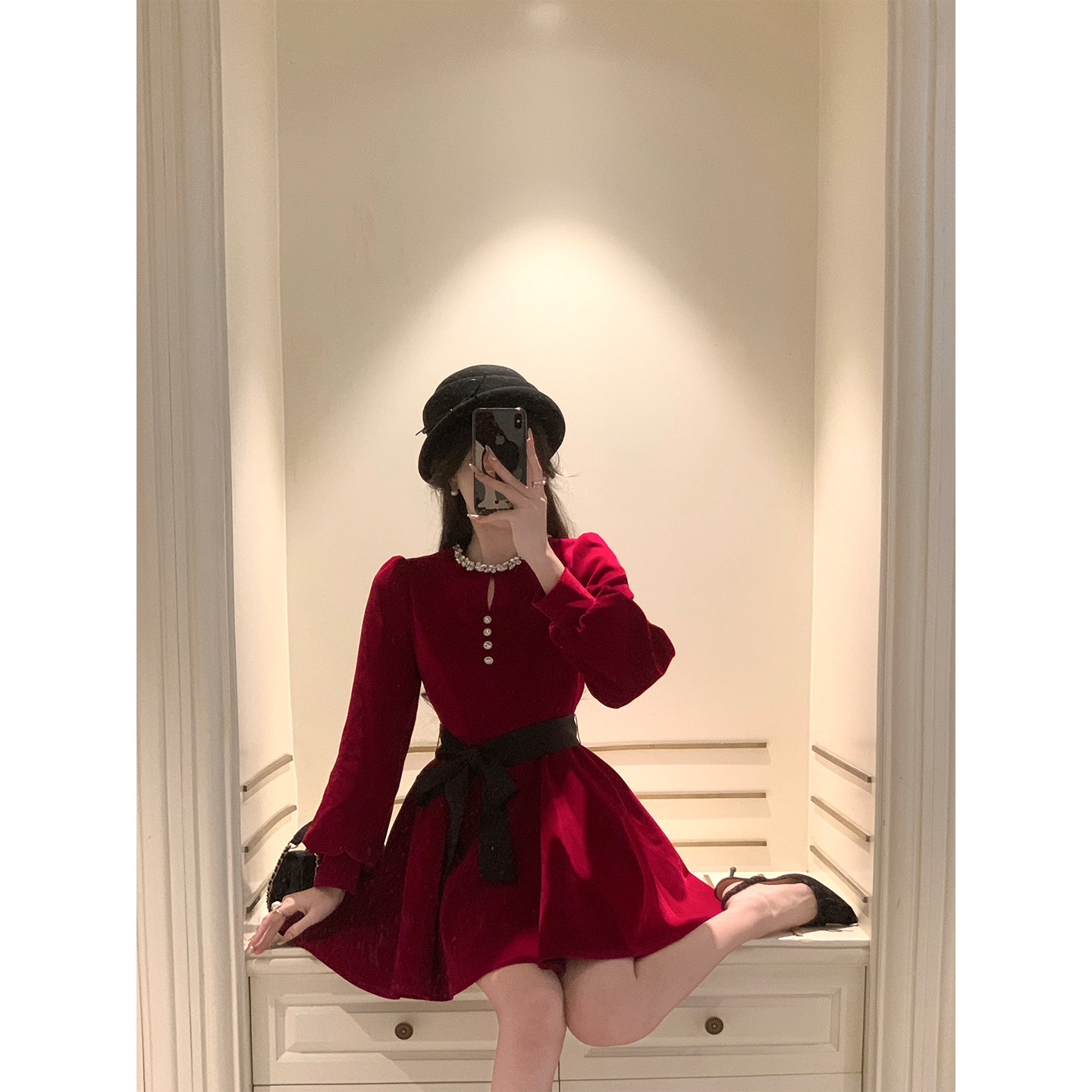 韩语琳法式红色丝绒连衣裙,以经典法式优雅为灵感,采用高级丝绒面料,触感柔滑,垂坠感佳,尽显女性高贵气质。裙身点缀精致钉钻,在光线下闪耀动人,宛如节日星光,为春季派对、圣诞晚宴增添一抹亮眼风采。修身剪裁凸显曼妙身姿,V领设计优雅迷人,后中隐形拉链方便穿脱。无论是作为圣诞战袍出席年会、约会或庆典,都能让你成为全场焦点。这款礼服裙融合浪漫与奢华,是节日季的必备单品,展现自信与魅力的同时,诠释现代女性的独特风情。