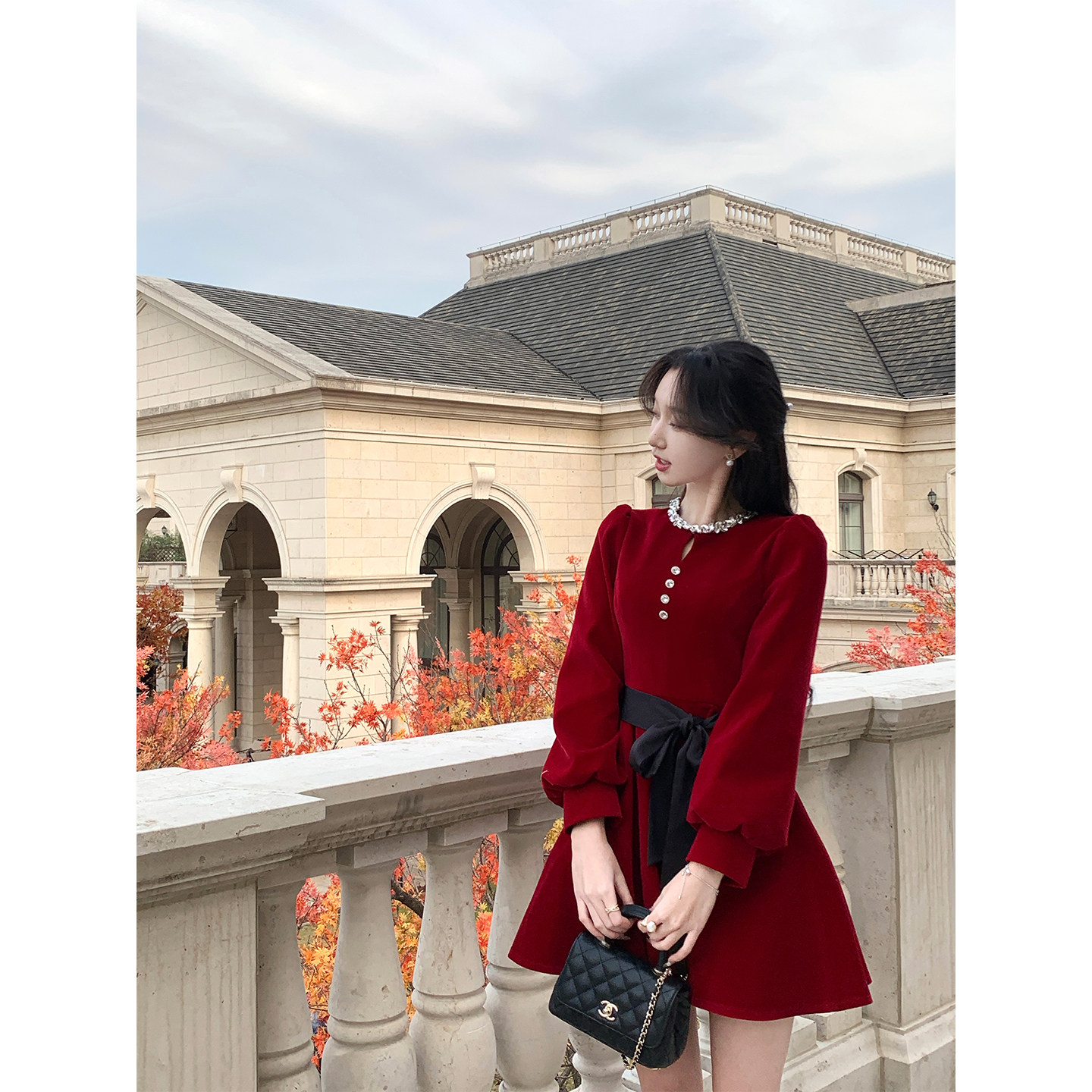 天猫韩语琳 法式红色丝绒连衣裙女春季圣诞节钉钻礼服裙战袍