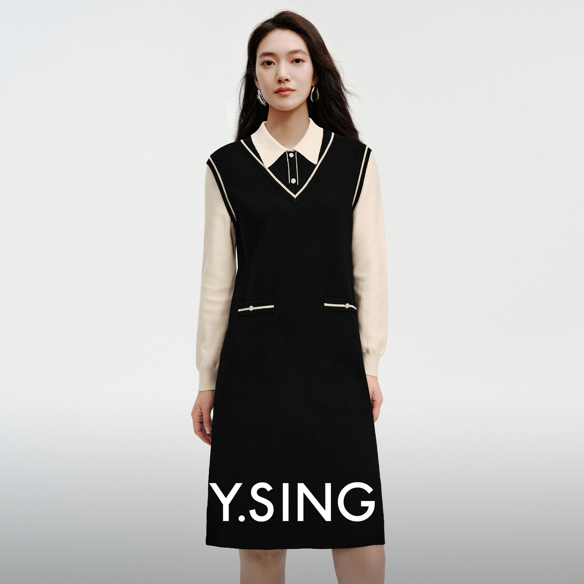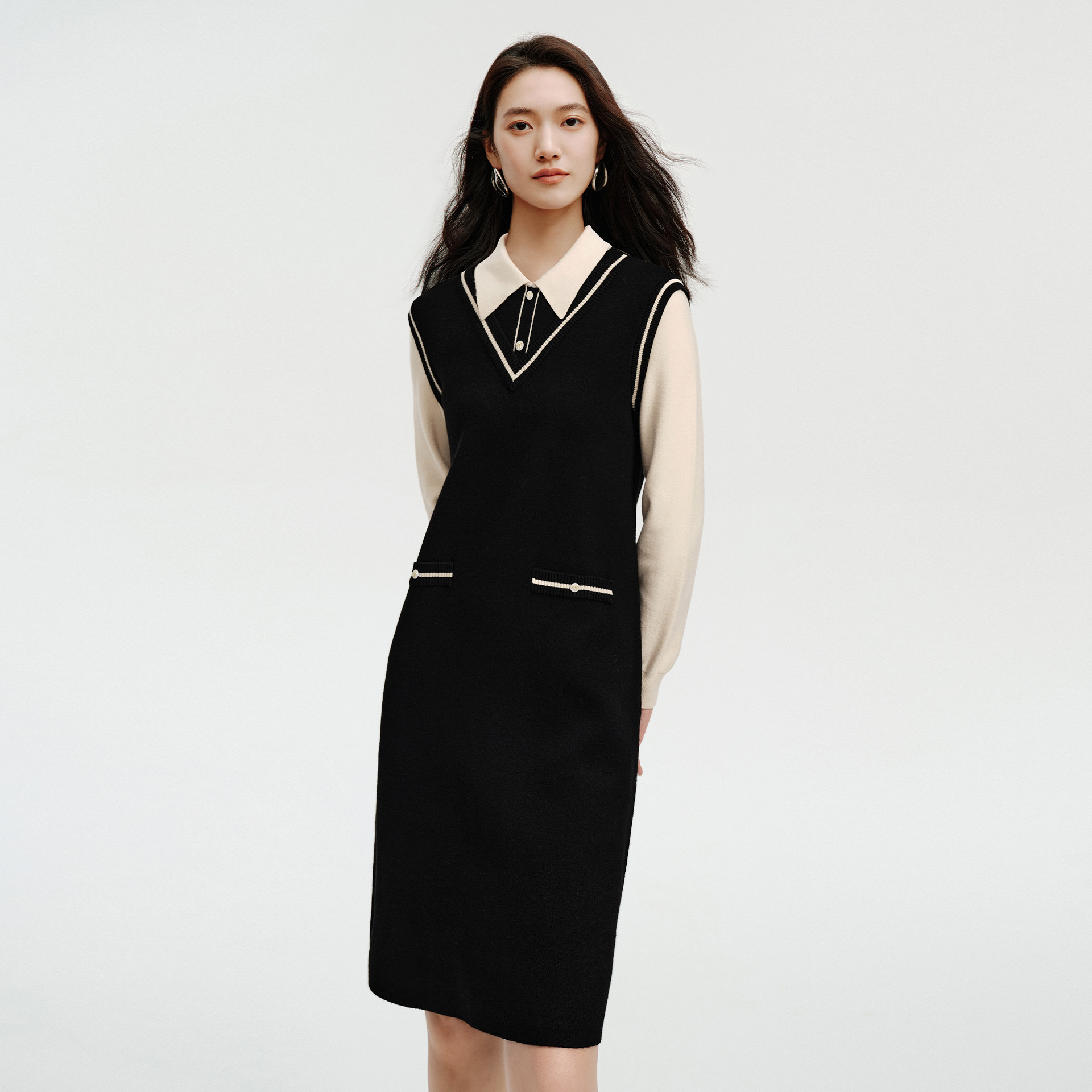 天猫衣香丽影假两件撞色连衣裙女2025冬装新款学院风翻领小香风长裙