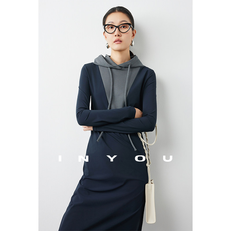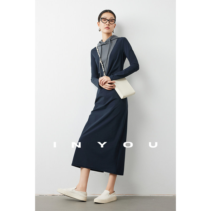 淘宝因由 休闲长款连帽卫衣裙女极简时髦修身显瘦过膝连衣裙配大衣