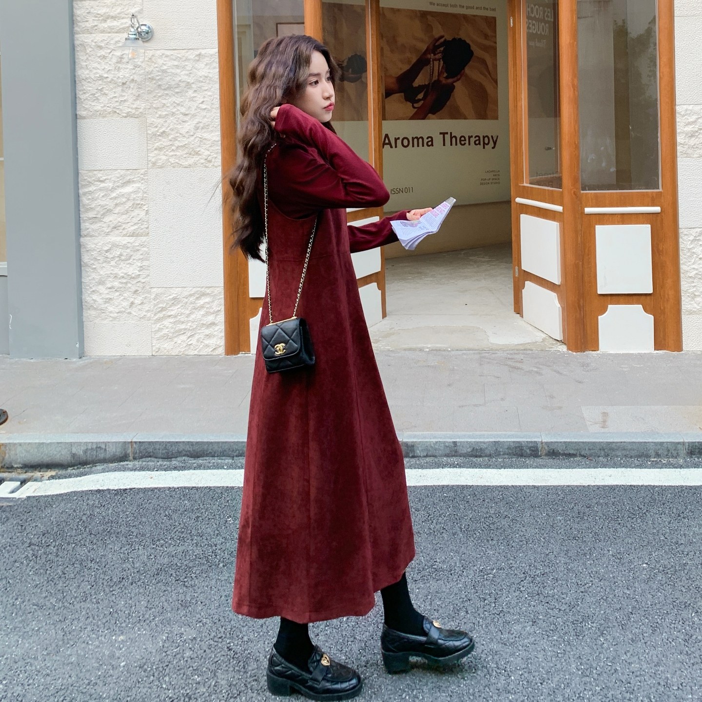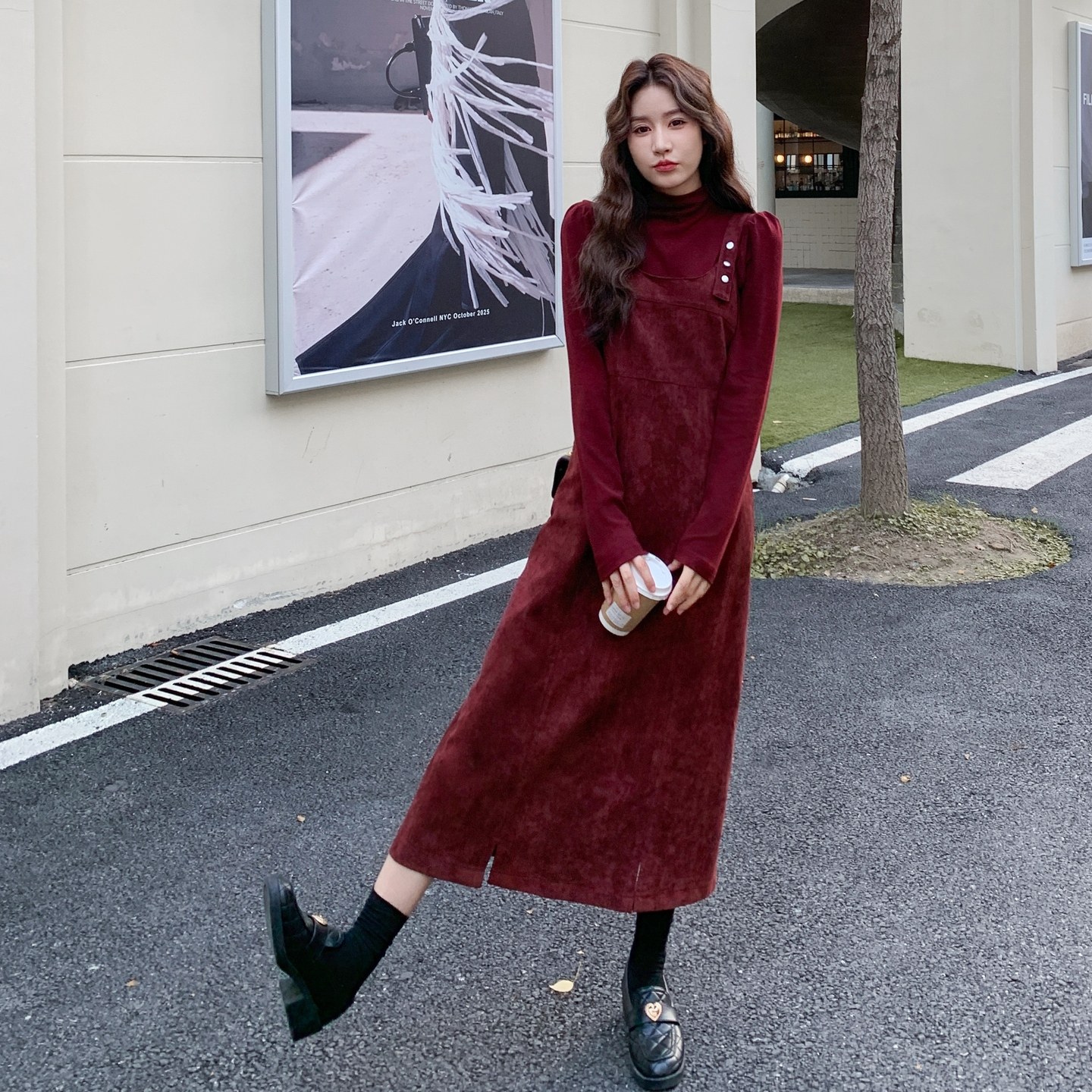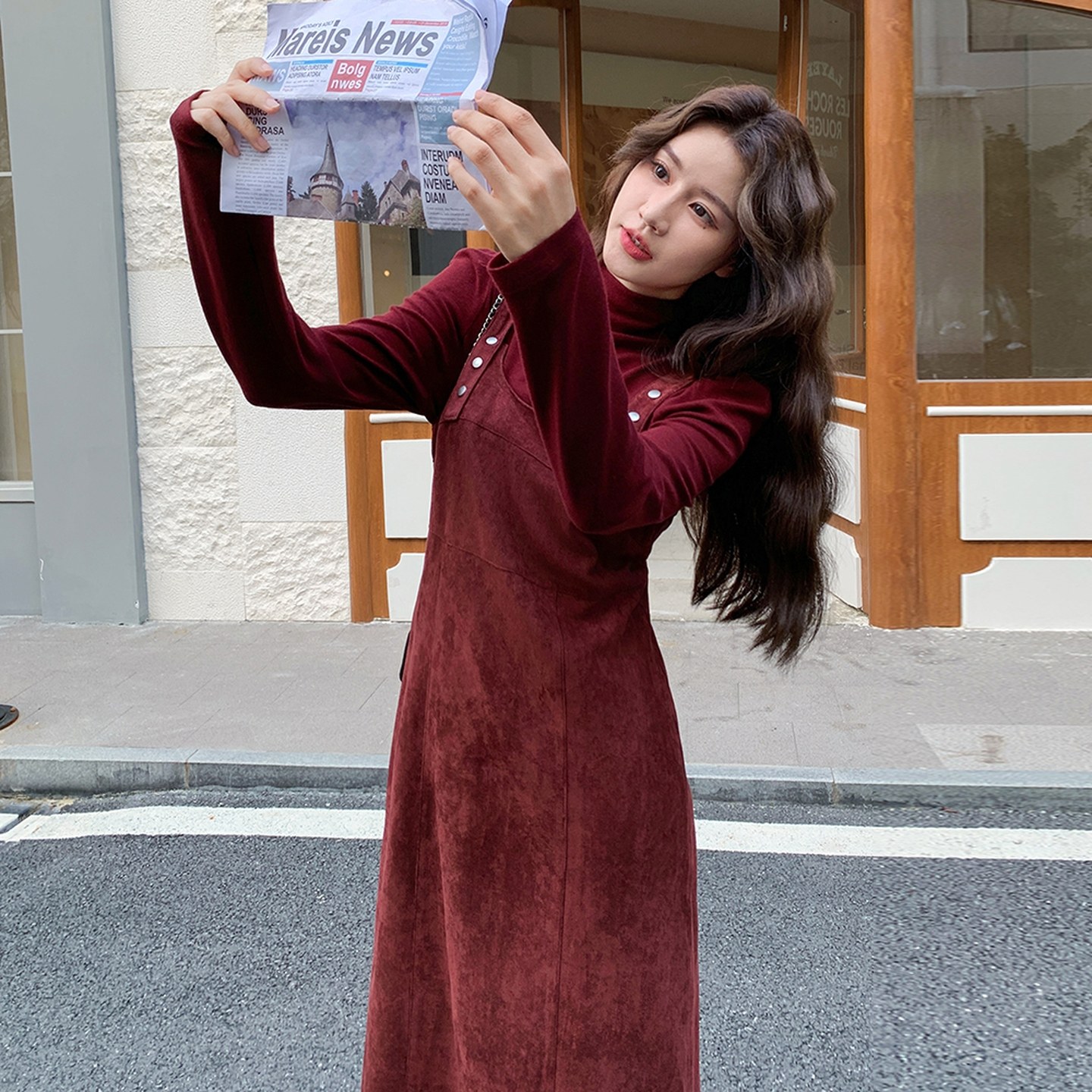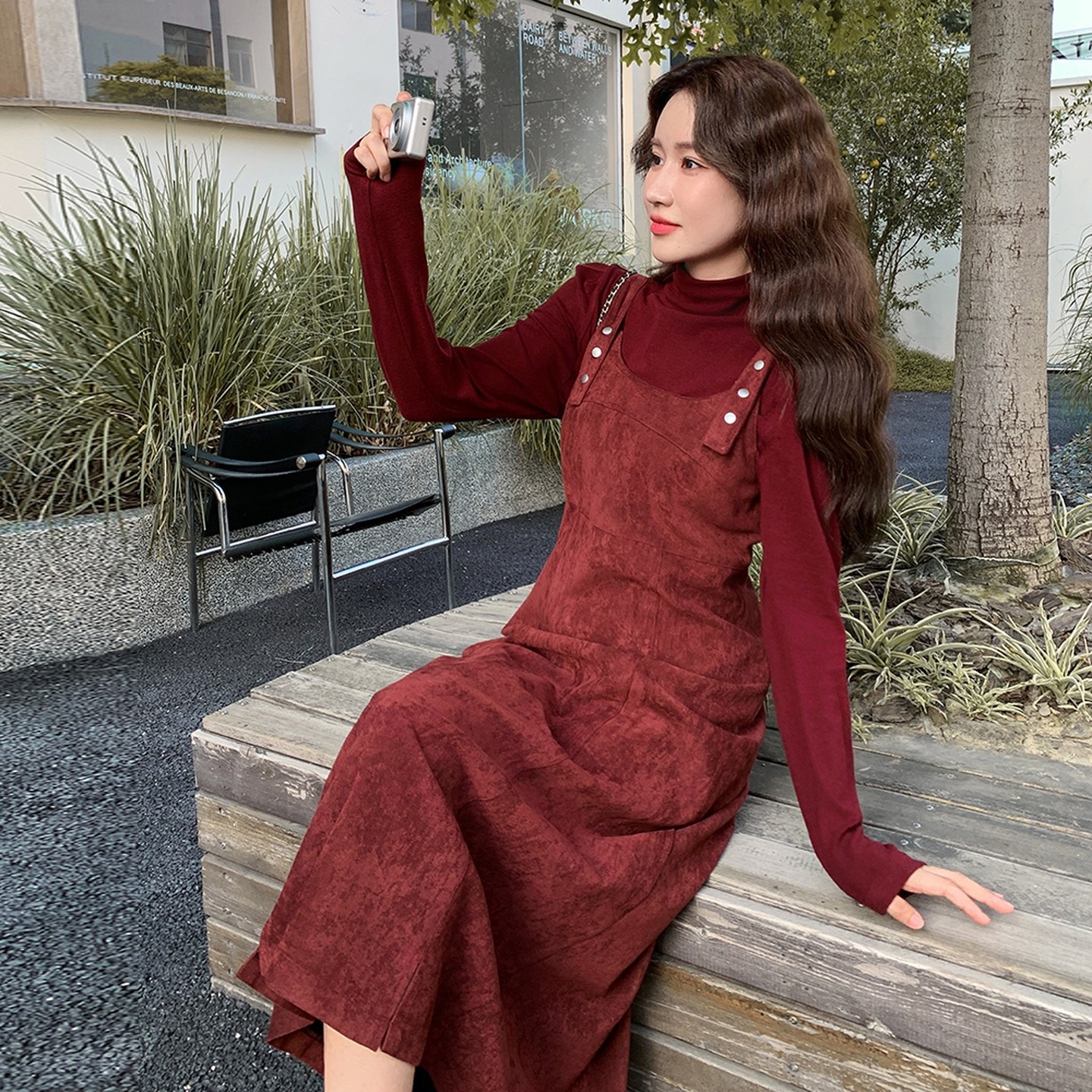 淘宝复古红色背带连衣裙女2025秋季新款高级感气质收腰显瘦两件套裙子