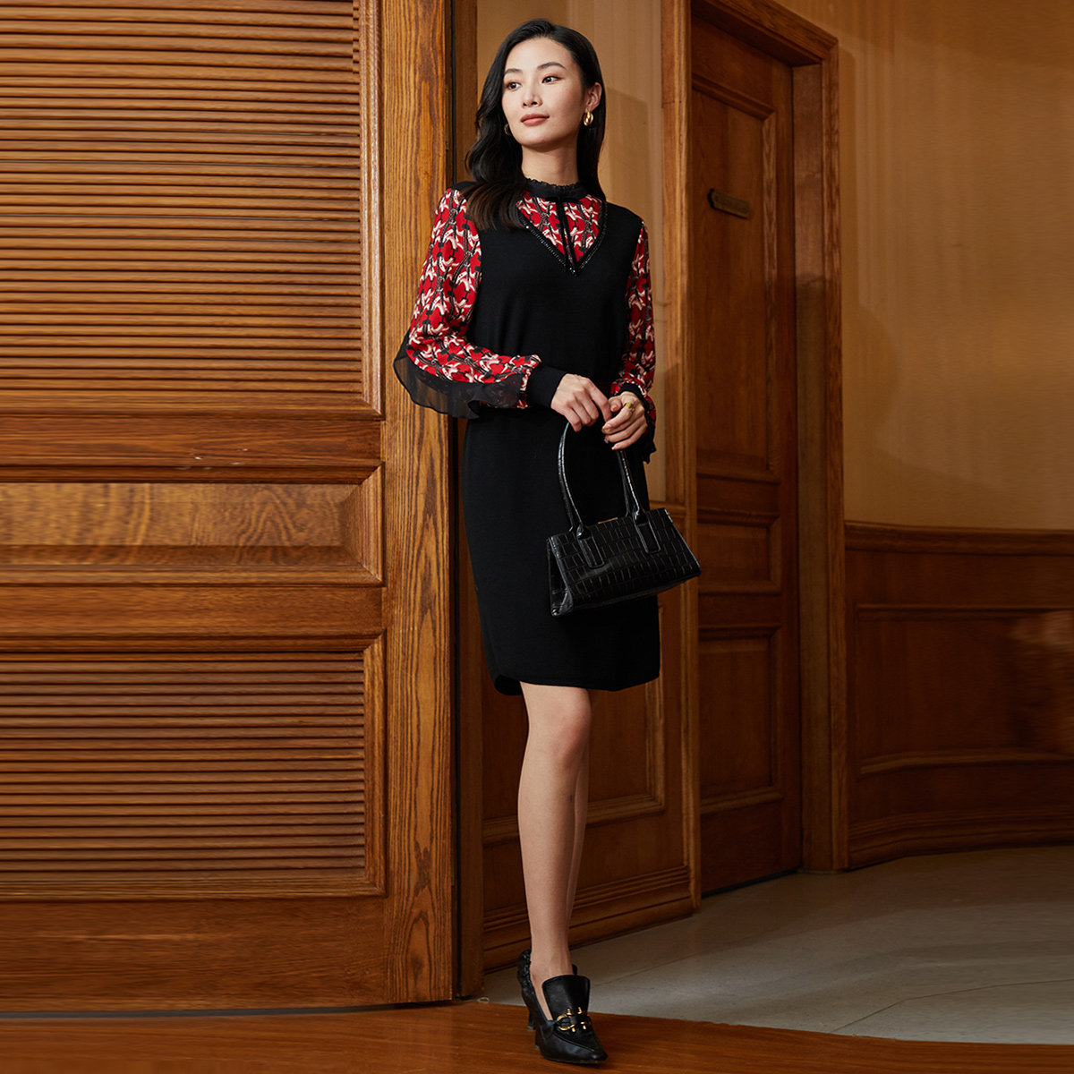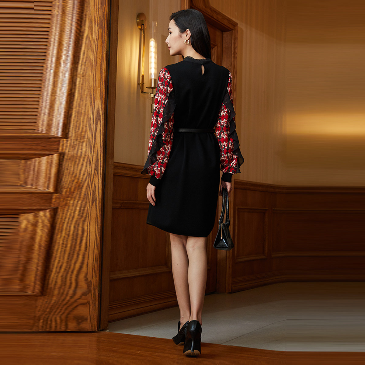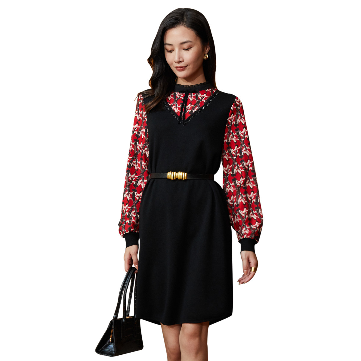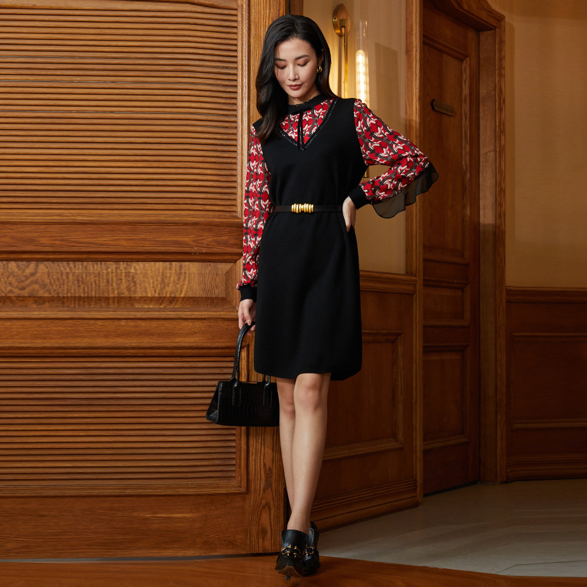 歌蒂诗2023秋季专柜新款1B41L1500连衣裙,融合优雅与知性,专为都市女性打造通勤新风尚。采用轻盈飘逸的雪纺长袖设计,搭配质感羊毛拼接裙身,刚柔并济,凸显女性温婉气质。精致剪裁贴合身形,高腰线设计拉长腿部比例,尽显曼妙曲线。低调雅致的色调与细腻纹理相得益彰,细节处彰显品质。无论是办公室穿搭,还是轻商务场合,皆能轻松驾驭,展现从容自信的职场魅力。这款连衣裙集舒适、时尚与实穿性于一体,是秋季衣橱不可或缺的优雅之选。