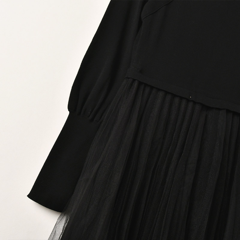 淘兰卡时尚2026春季新款黑色一字肩连衣裙长袖针织收腰百褶短裙女