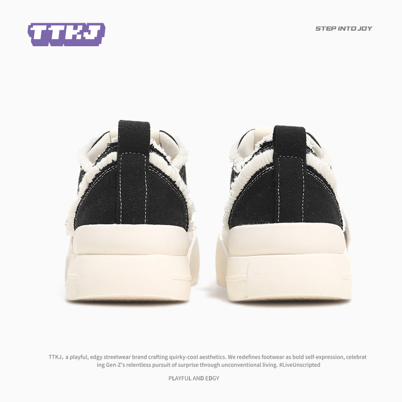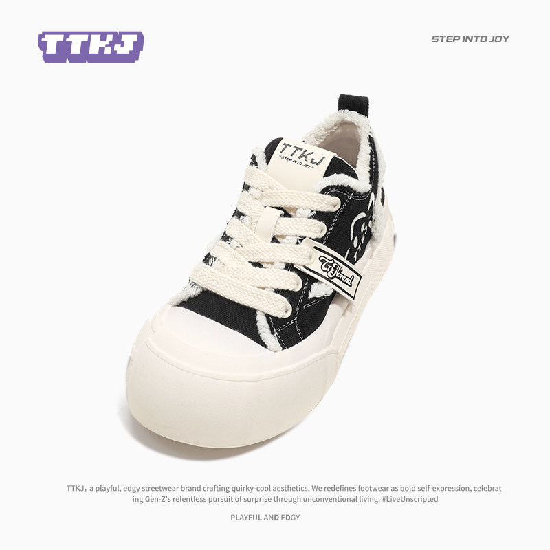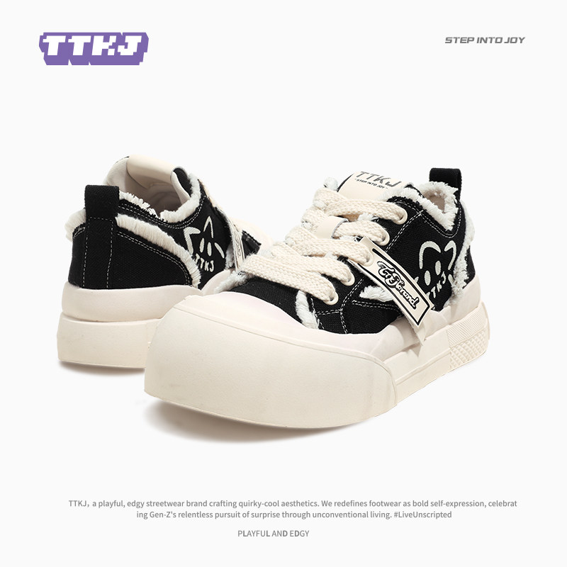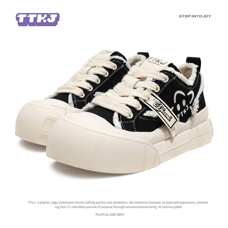 丑萌帆布鞋女黑色毛毛鞋低帮春秋大头鞋厚底小众男大码女鞋胖脚