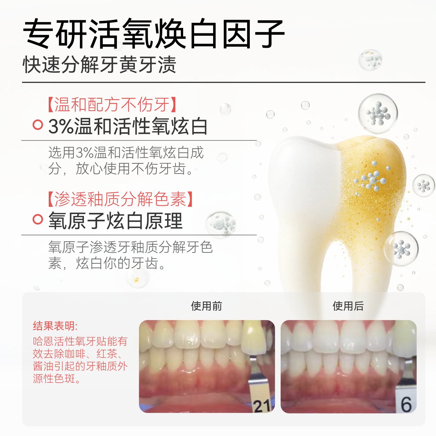 【好物体验专享】哈恩6D微晶无水超粘式亮白牙贴,采用创新无水配方与6D微晶技术,贴合更紧密,有效成分直达牙面,深入分解色素沉积。独特超粘设计,佩戴稳固不移位,使用更安心。不含水配方避免刺激,温和不酸牙,适合敏感人群。每次使用30分钟,连续7天即可显著提亮牙色,重现自然亮白笑容。独立包装,便携卫生,随时随地开启美白之旅。哈恩专注口腔护理科技,安全有效,值得信赖。现在体验专享价,开启自信笑容新体验!