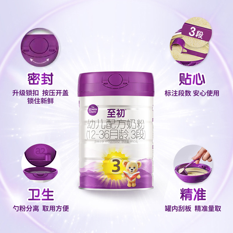 a2至初3段幼儿配方奶粉专为12-36个月宝宝精心研制,采用源自新西兰的天然A2 β-酪蛋白,更贴合宝宝娇嫩肠胃,易于消化吸收。每罐850g大容量设计,6罐装满足家庭长期需求,性价比更高。配方富含DHA、ARA、益生元及多种维生素矿物质,支持宝宝眼脑发育与免疫力提升。全程严格品控,奶源纯净安全,无人工添加蔗糖,口感清淡自然。a2至初致力于为中国宝宝提供高品质营养,助力健康成长每一步,是万千妈妈信赖的选择。