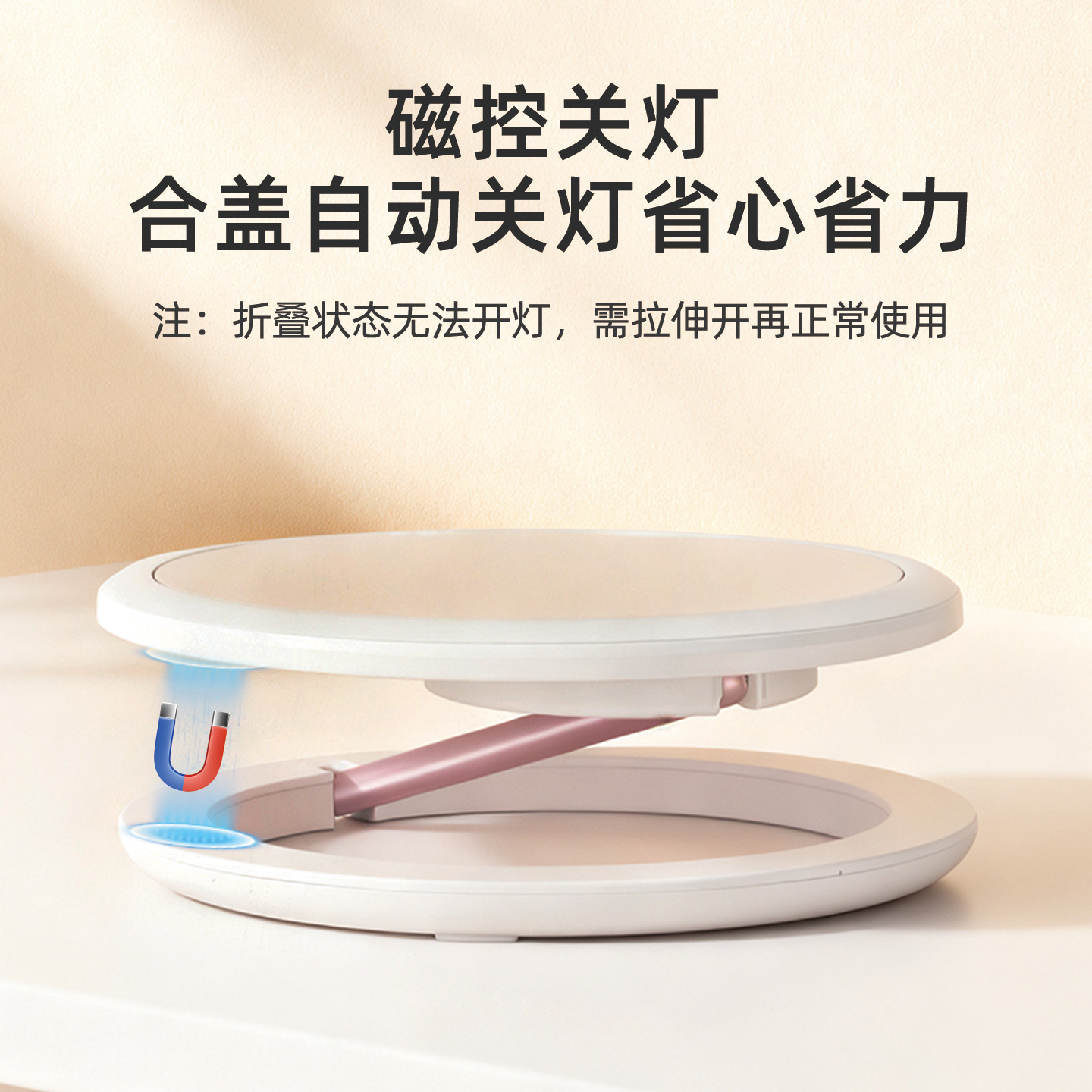 帝门特折叠便携LED台式化妆镜,集实用与美观于一体,专为现代女性打造。采用高清银镜设计,真实还原肤色与妆容细节,搭配360°无阴影LED环形灯,提供自然柔光,支持三档调光,满足不同环境补光需求。镜身可90°折叠,轻巧便携,适合居家梳妆或旅行携带。内置大容量锂电池,USB充电设计,续航持久,告别频繁充电烦恼。底座稳固,桌面摆放不晃动,兼具收纳功能。无论是日常化妆、护肤,还是出差旅行,帝门特化妆镜都是贴心助手,让美丽时刻在线,随时随地绽放自信光彩。