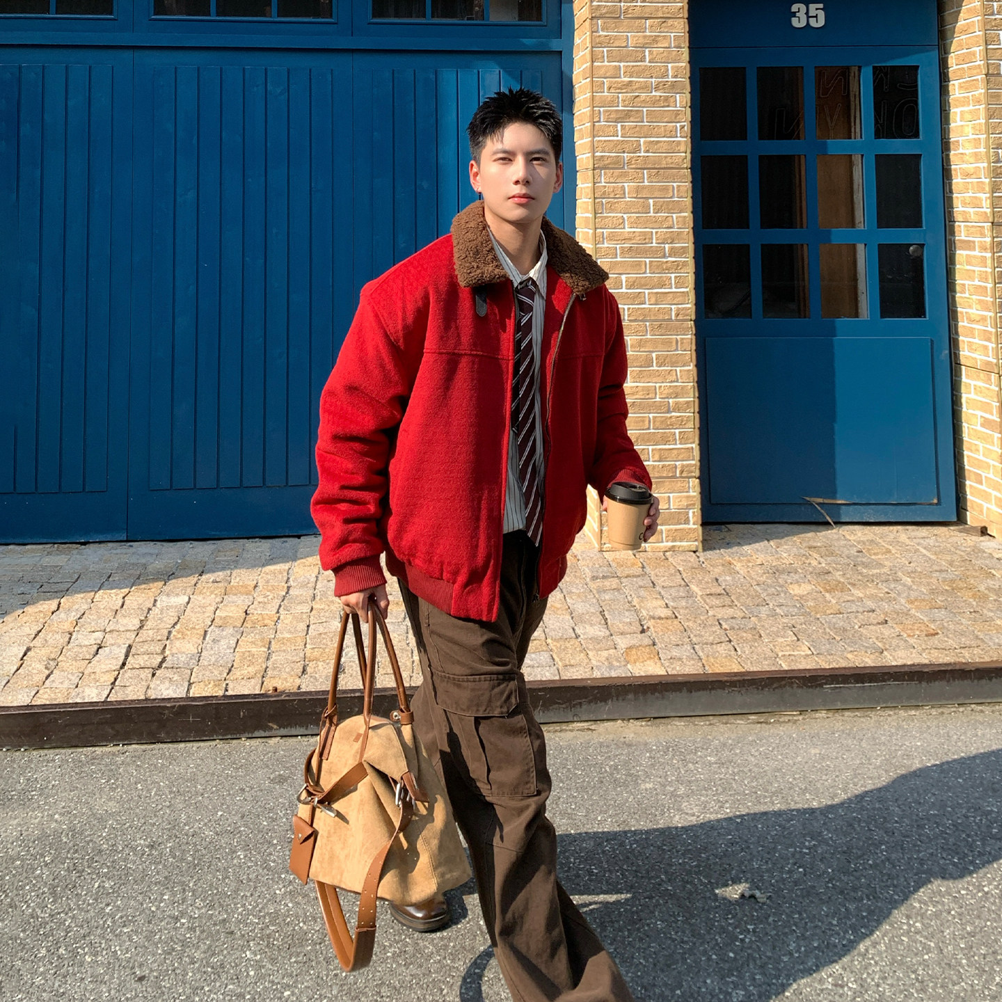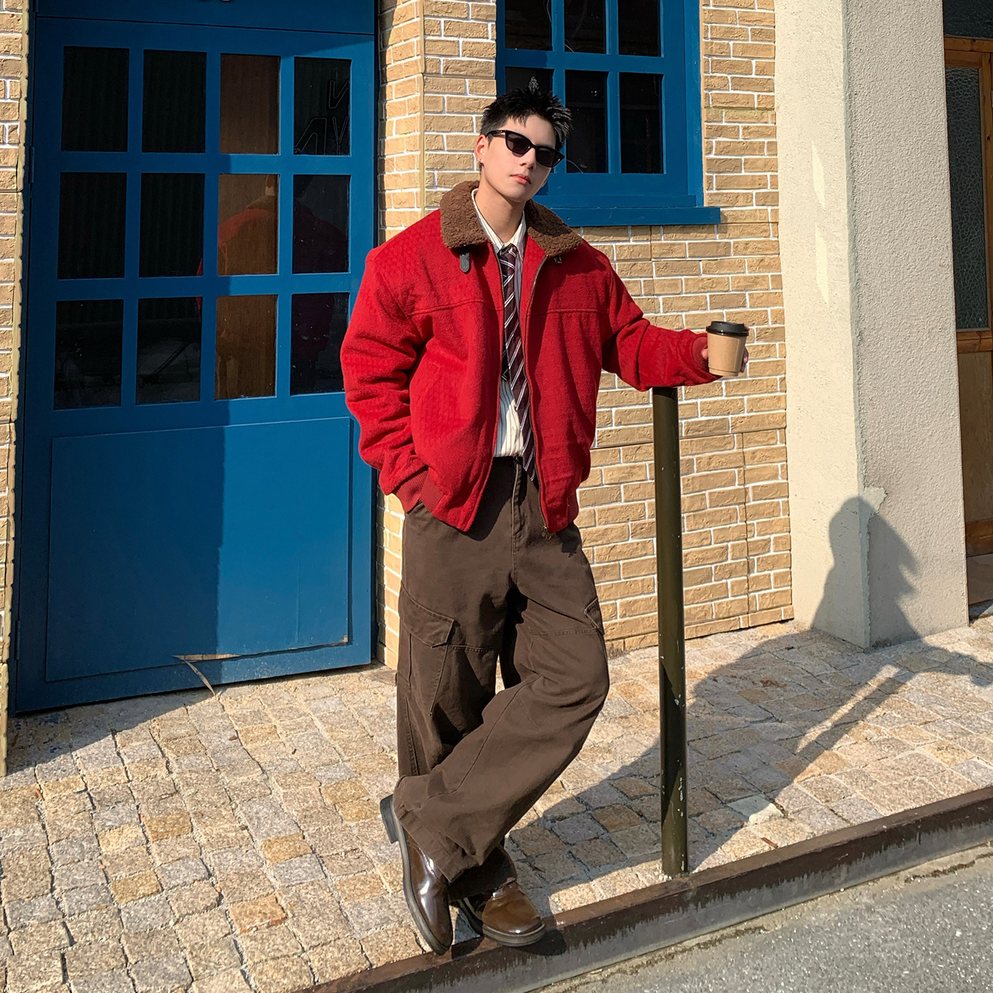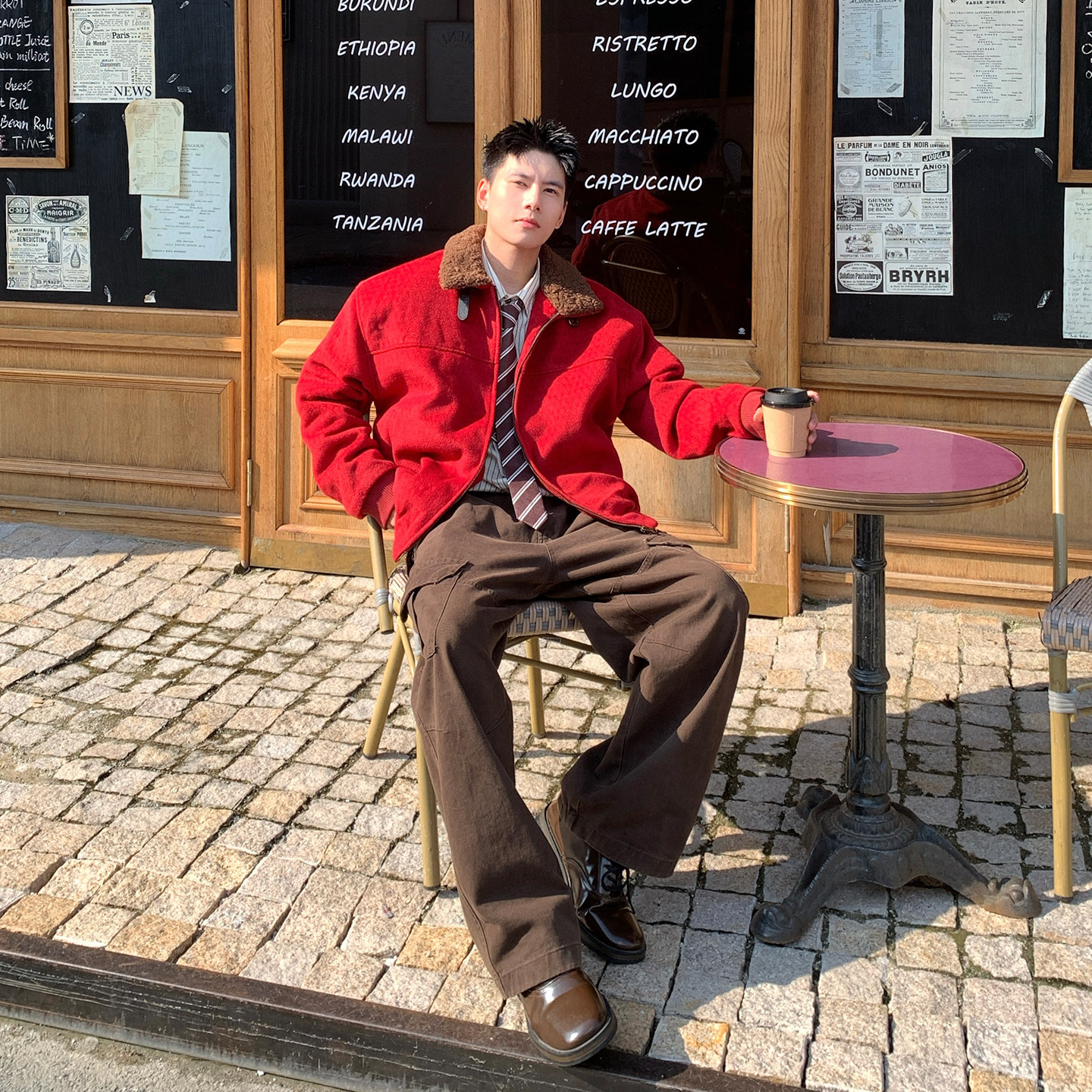 淘宝Holocene美式潮牌重磅羊羔毛领工装夹克男秋复古休闲翻领毛呢外套