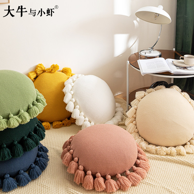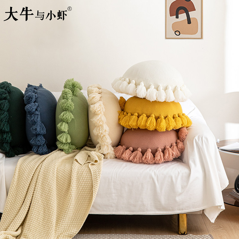 淘宝北欧纯色向阳花可爱球球吊穗圆形抱枕套飘窗靠垫客厅沙发抱枕蒲团