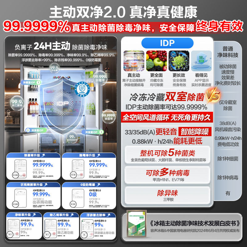 容声方糖505L主动双净双系统十字四门冰箱,集高效保鲜与智能净味于一体。搭载双制冷系统,冷藏冷冻独立循环,避免串味,锁鲜更持久。主动双净技术(IDP主动净化+负离子除菌),24小时动态杀菌除味,食材更安心。十字四门设计,505L大容量合理分区,满足家庭储鲜需求。超薄机身支持嵌入式安装,节省空间且美观大方。内置自动制冰功能,便捷制取冰块,提升生活品质。一级能效,节能静音,兼顾环保与舒适体验,是现代智慧厨房的理想之选。