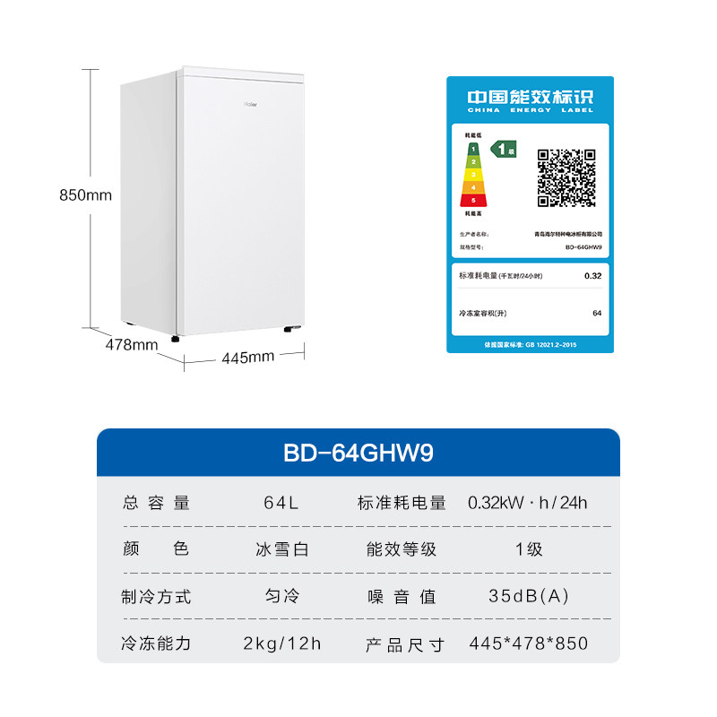 天猫海尔64L母乳储奶冷冻柜迷你家用保鲜冰柜小型立式1级节能冷柜冰箱