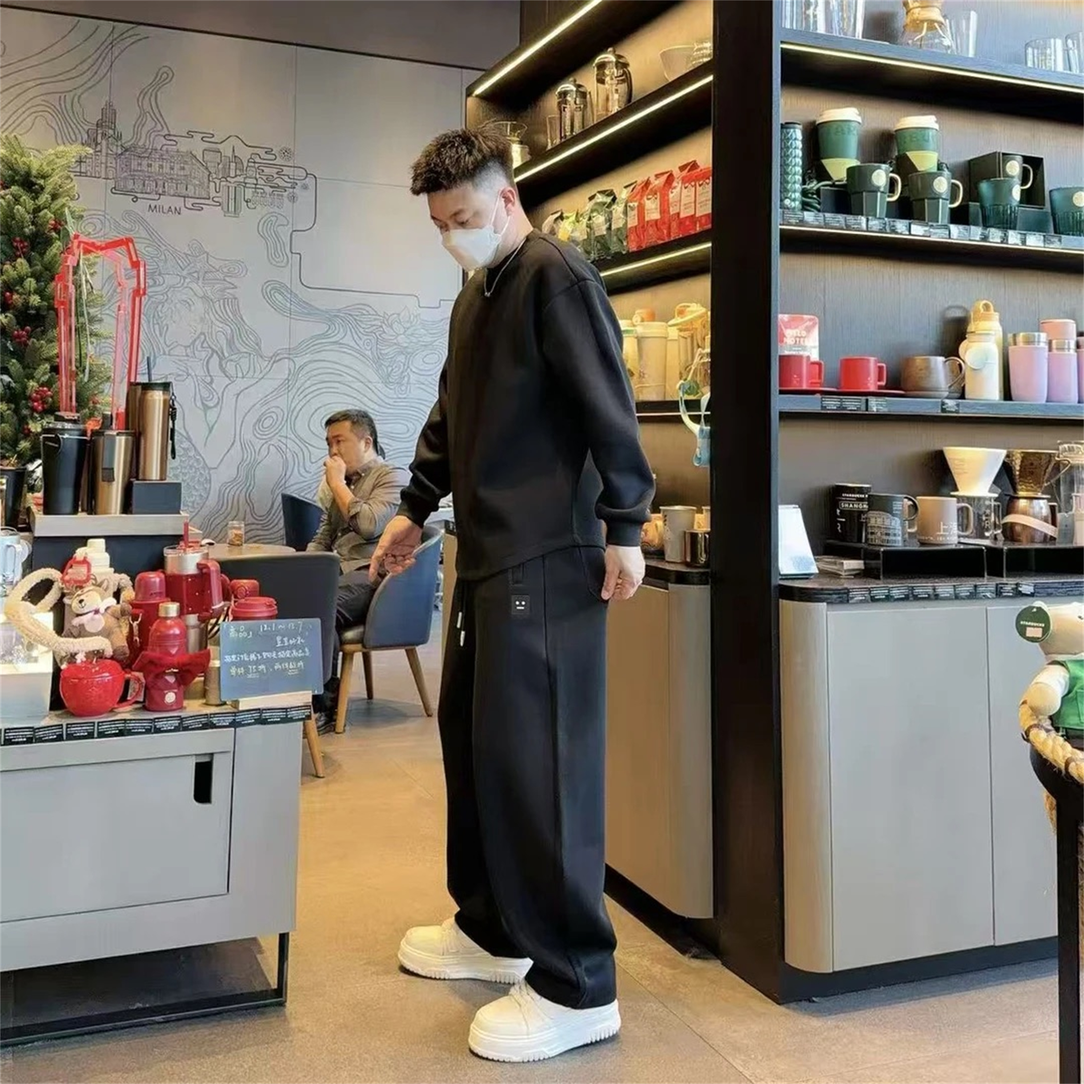淘黑色半高领拉链卫衣卫裤运动休闲套装加绒加厚男士秋冬冬装一整套