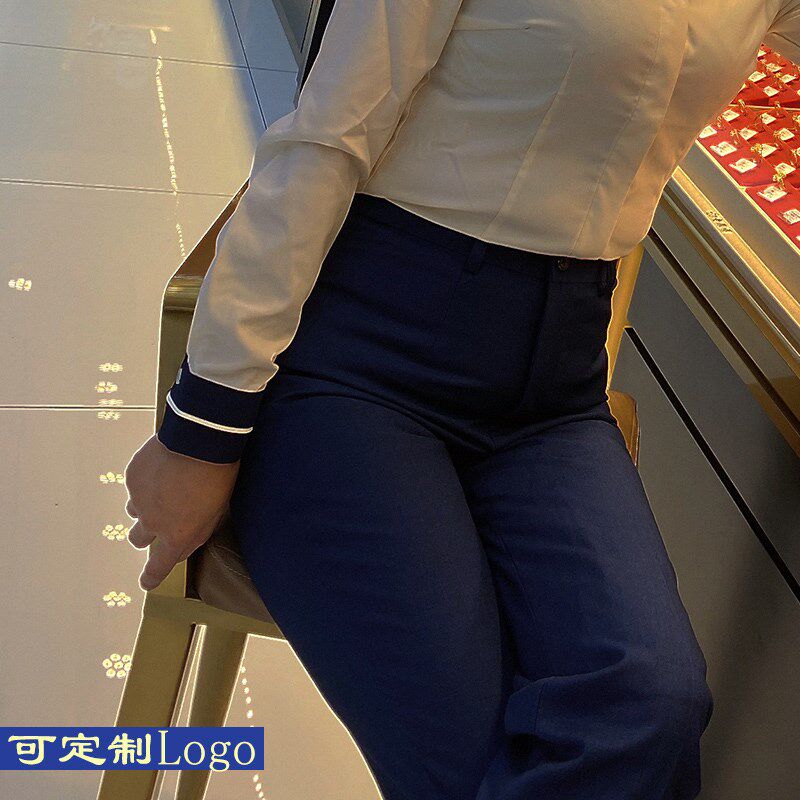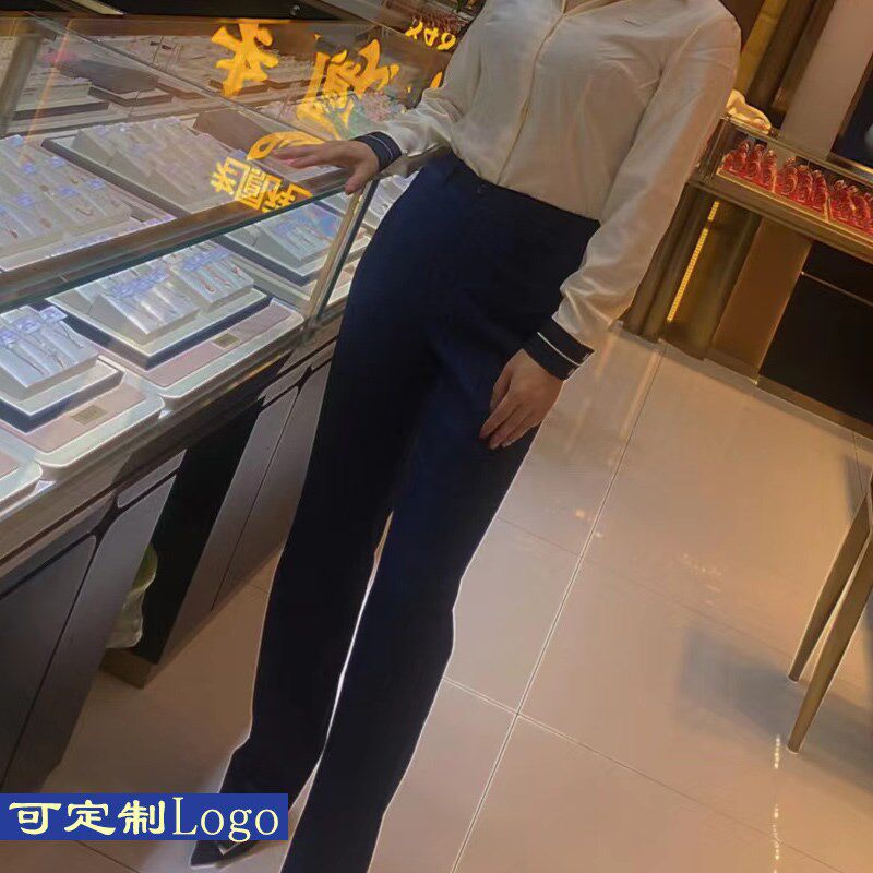 这款秋冬女装西裤采用经典老深蓝色调,沉稳大方,适合珠宝店、金店等高端服务场所作为工作服穿着。高腰松紧设计,穿着舒适且方便活动,兼顾专业形象与日常实用性。面料挺括有型,抗皱耐磨,适合长时间站立工作。简约利落的剪裁凸显女性干练气质,搭配衬衫或针织衫皆宜。凤祥银楼等珠宝品牌选用此款,既体现品牌格调,又提升员工整体形象。整体设计注重细节与品质,是服务行业女性秋冬着装的优选单品,兼顾美观、舒适与职业感。
