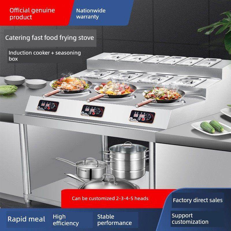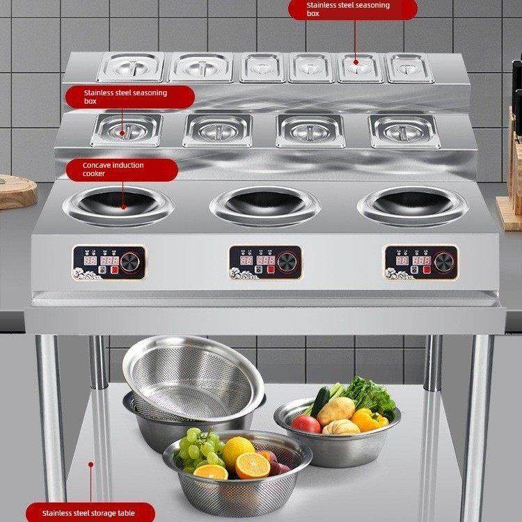 商用电磁炉三头三眼炒灶“小锅现炒小炒灶”专为中式快餐及小炒餐厅设计,配备三个独立加热灶眼,可同时进行多道菜品烹制,提升出餐效率。采用大功率电磁加热技术,火力强劲且精准控温,完美还原传统猛火快炒口感。特别适用于“七碗香香”“八爷辣椒炒肉”等招牌小炒,锁住食材鲜香,口感地道。灶体结构紧凑,操作便捷,节能环保,清洁维护简单,适合小吃店、社区食堂、快餐店等商用场景。小锅现炒模式更贴合现炒现卖需求,保障菜品热度与风味,是追求高效与品质的餐饮业主理想之选。