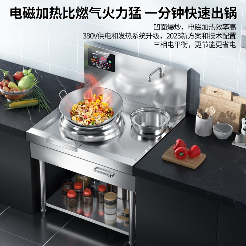 商用电磁炉大功率15KW电炒锅,专为饭店、食堂、餐厅等高强度厨房环境设计。采用凹面加热技术,聚能高效,火力迅猛,媲美传统明火炒灶,轻松实现猛火爆炒。额定功率20000W,升温快、热效率高,节能环保,操作安全便捷。配备智能温控系统,精准调节火候,满足多样烹饪需求。炉体结构坚固耐用,易清洁维护,适合长时间连续作业。无明火、低噪音、无废气排放,有效改善厨房工作环境。适用于中式爆炒、煎炸、炖煮等多种烹饪方式,是商用厨房提升效率的理想之选。