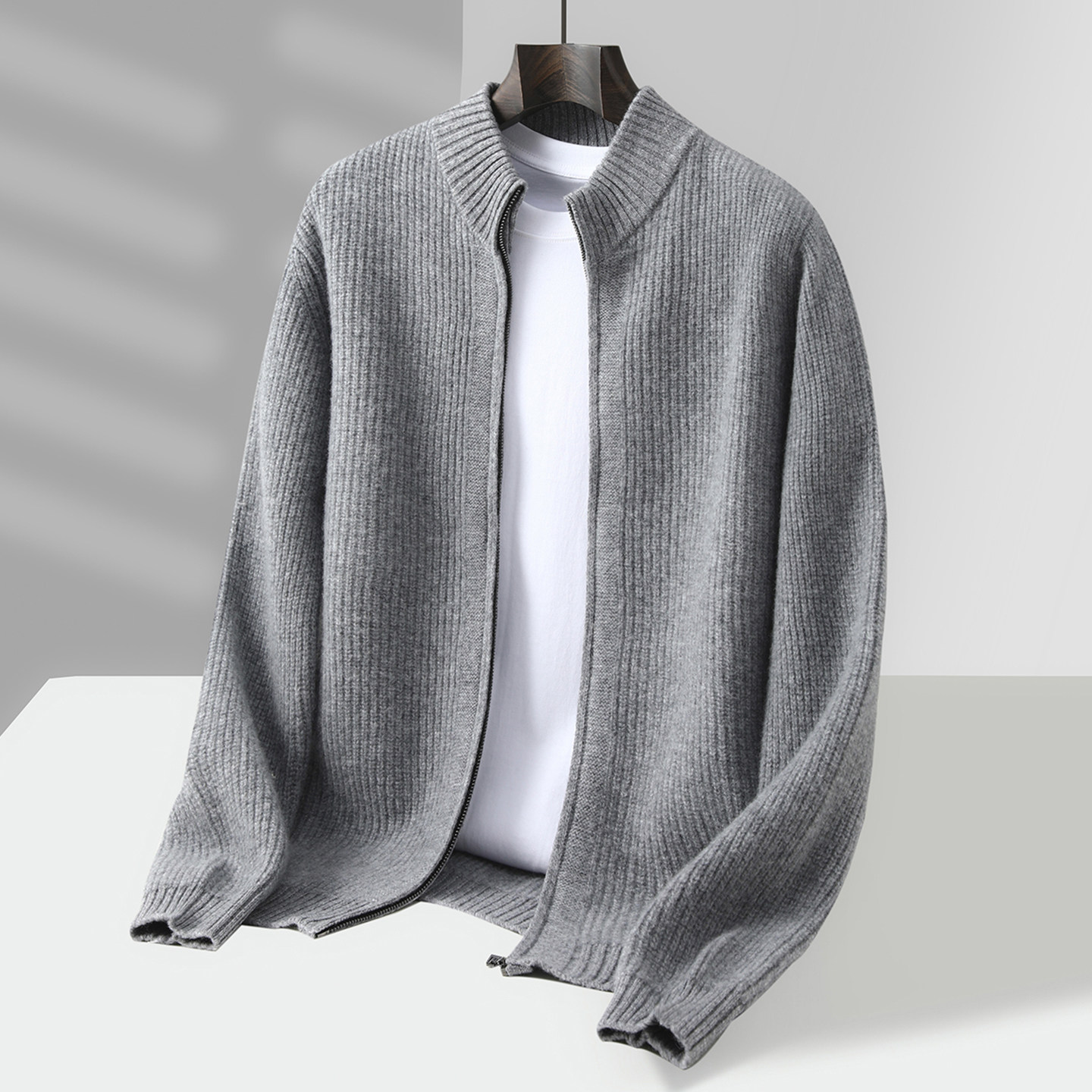 淘宝高端新款100%纯羊毛开衫男半高领加厚毛衣元宝针拉链宽松羊绒外套