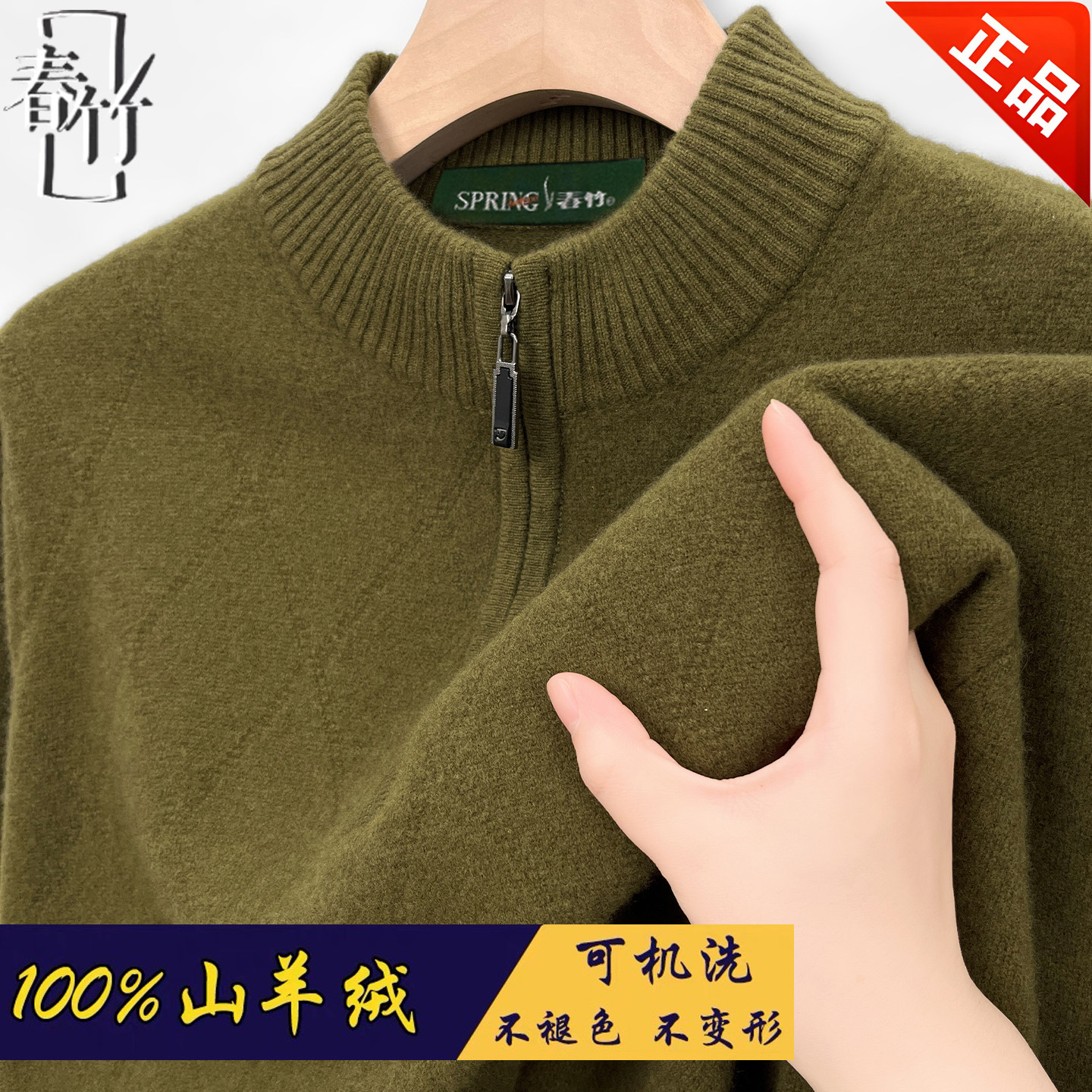 淘宝正品春竹100%羊绒衫男半高拉链领宽松针织加厚羊绒打底衫毛衣热卖