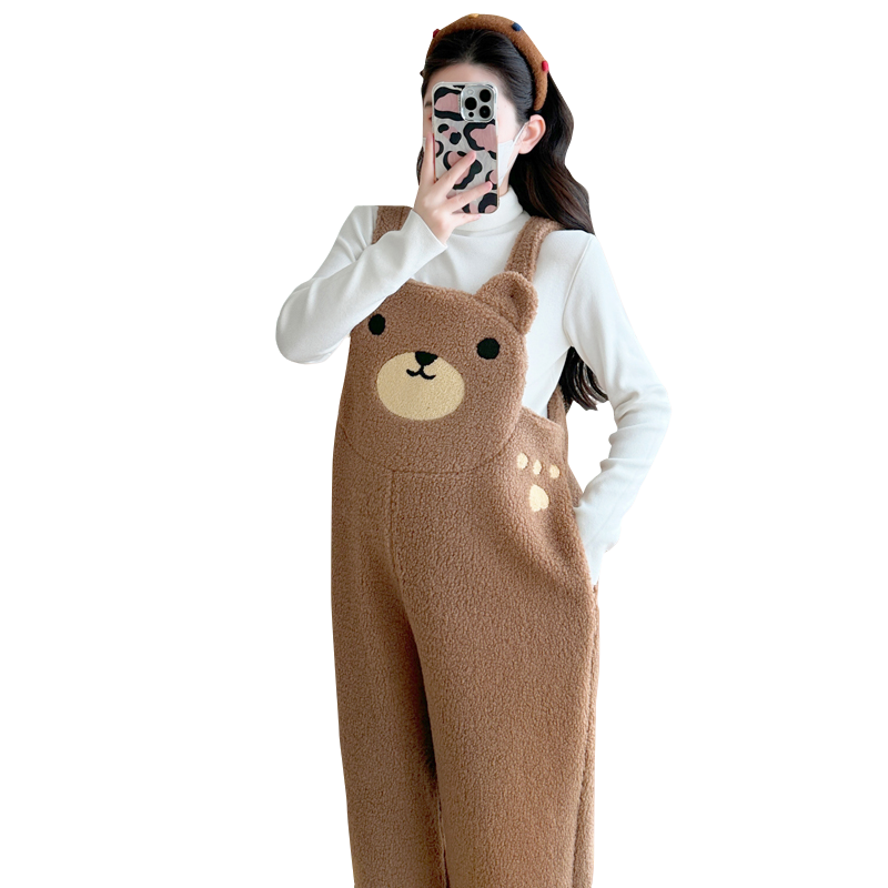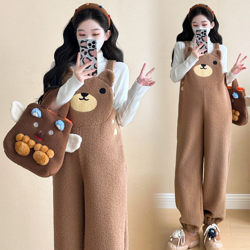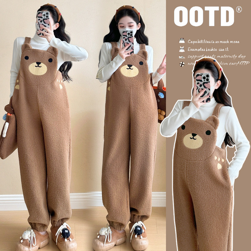 淘宝大码孕妇裤秋冬加绒加厚羊羔绒小熊背带裤+毛衣打底衫两件套200斤