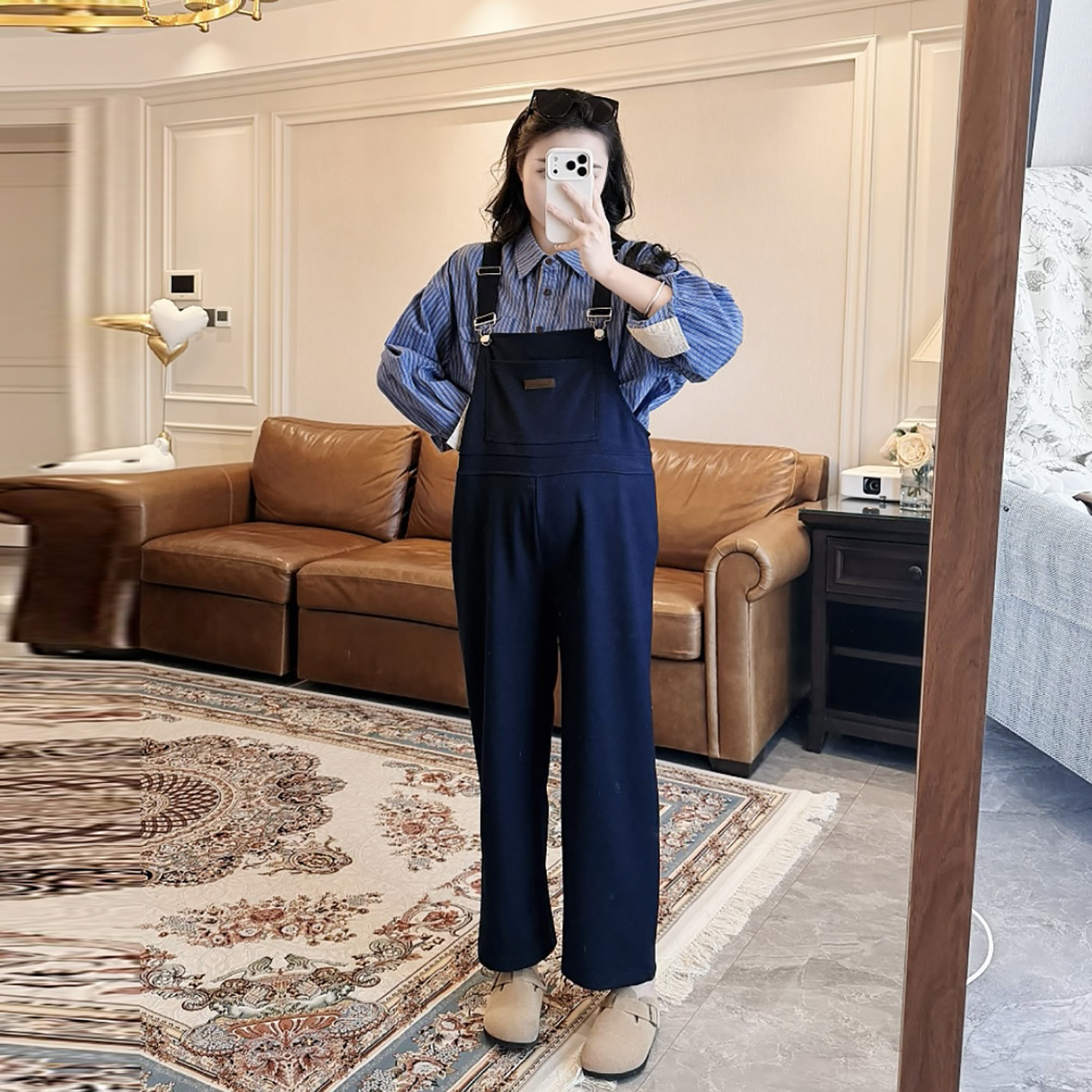 孕妇牛仔背带裤秋冬外穿加绒套装宽松大码牛仔裤小个子春秋两件套