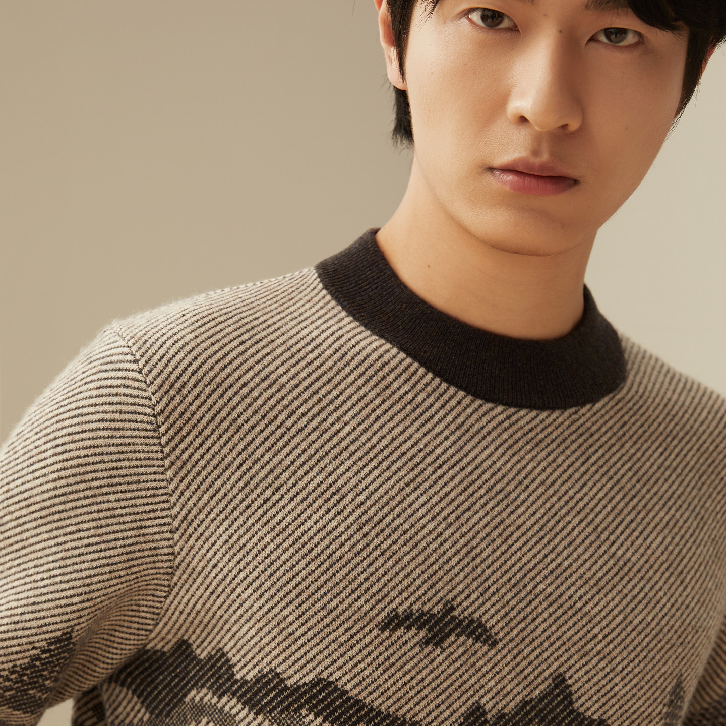 设计师款佐丹奴棕色系针织衫男装提花肌理感宽松圆领毛衣18055704