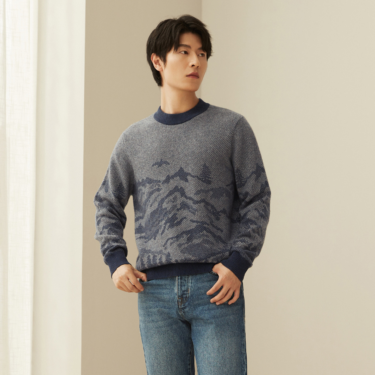淘上海春竹山羊绒衫男士圆领加厚100%纯羊绒压花工艺休闲针织衫毛衣