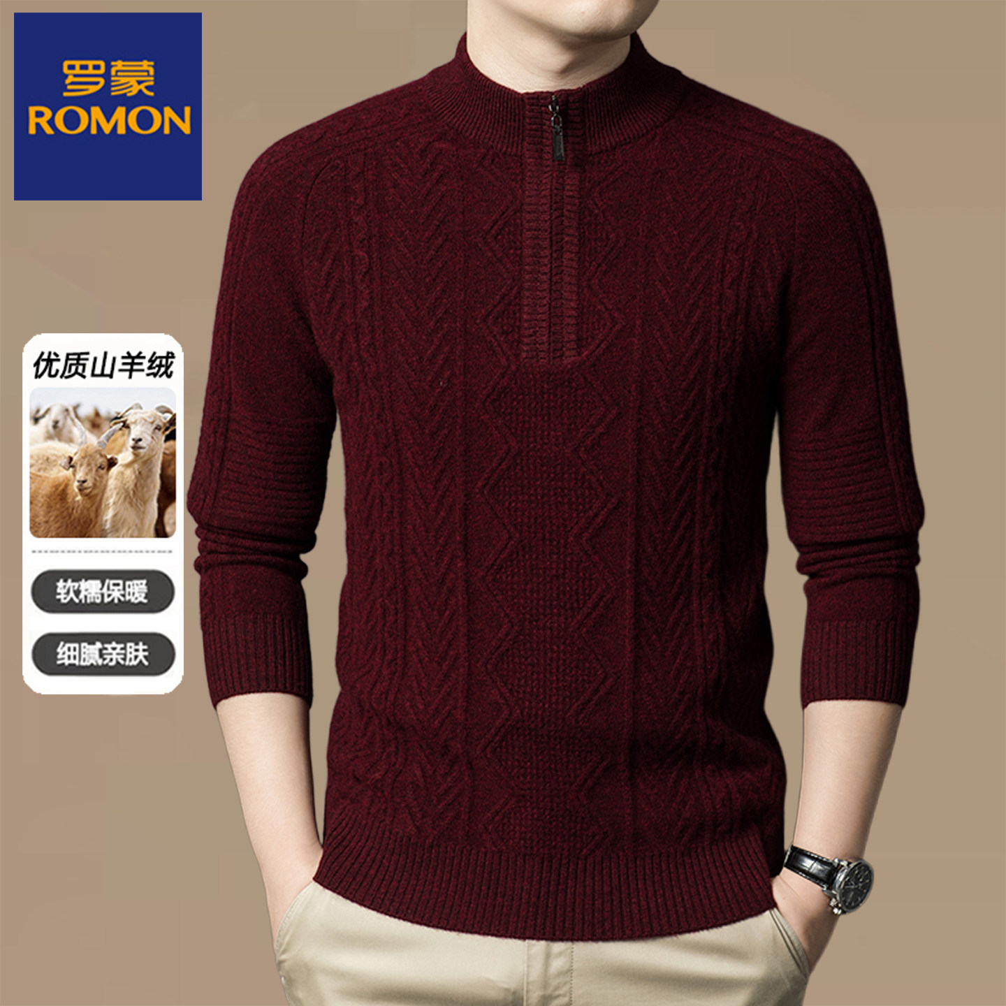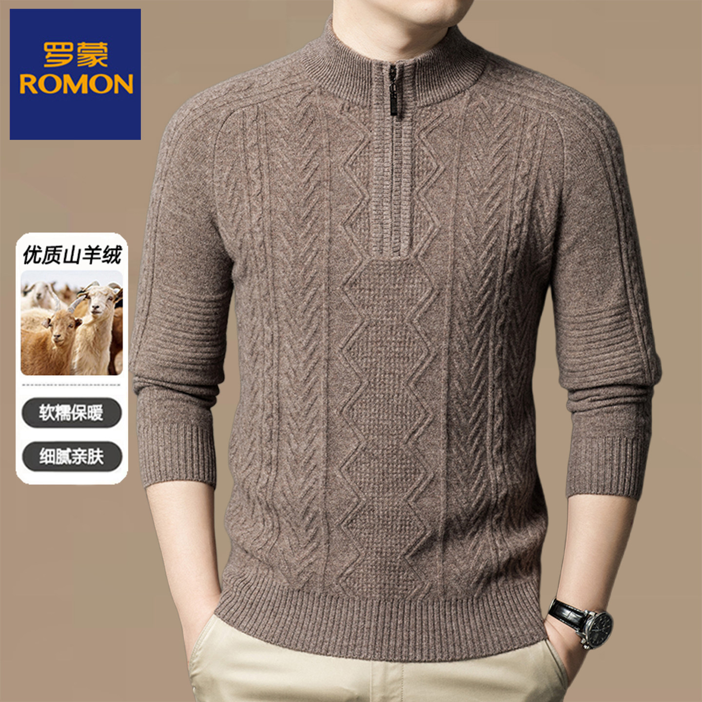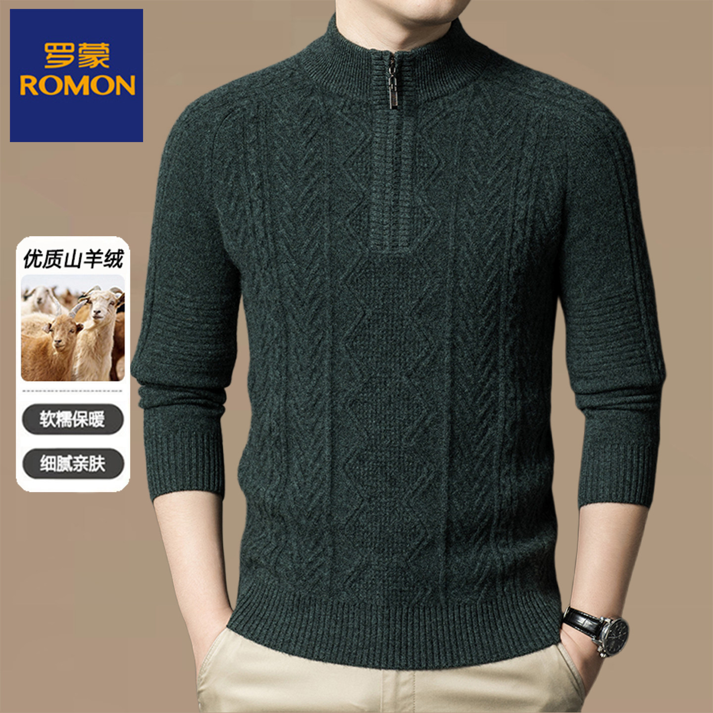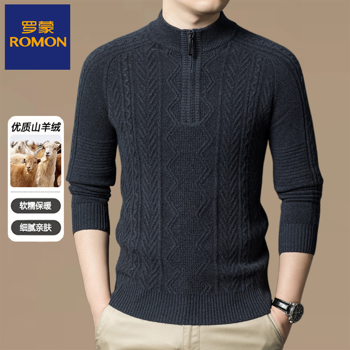 淘宝罗蒙秋冬厚款男士半高领纯羊绒针织衫中老年拉链领保暖套头毛衣男