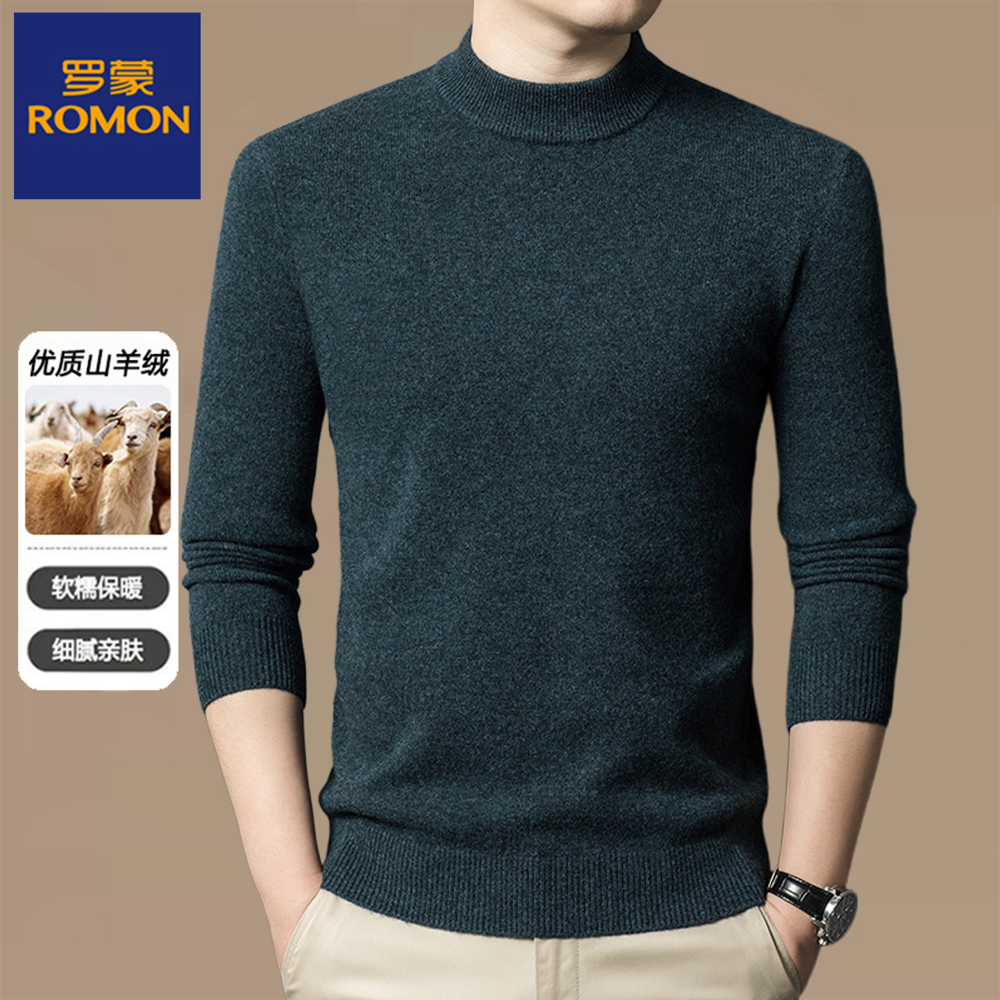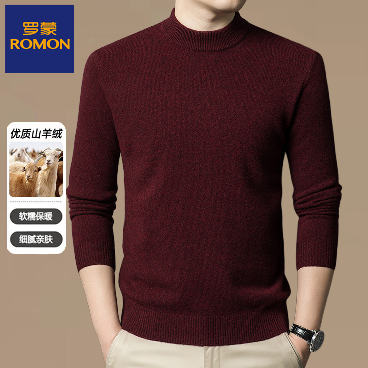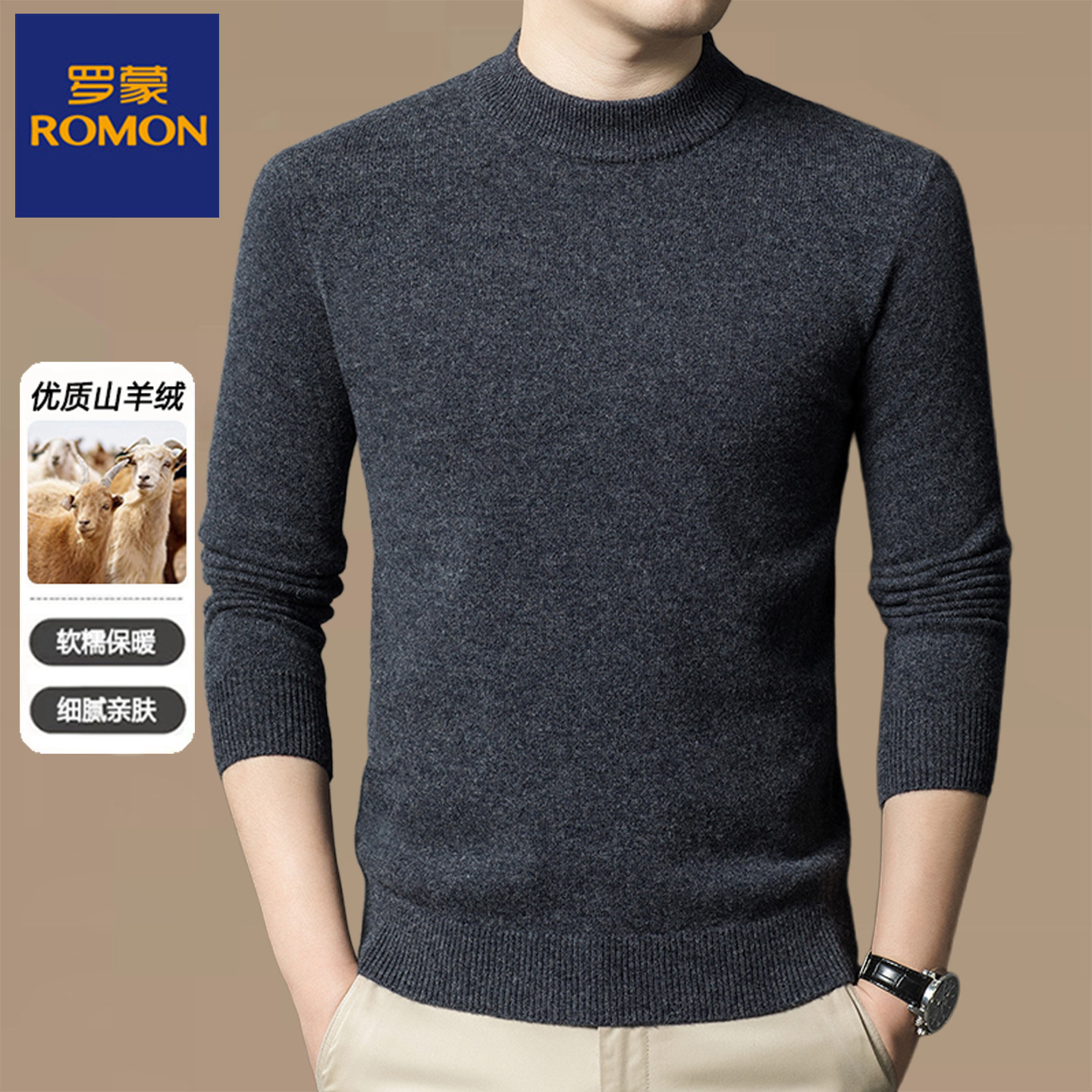 淘宝罗蒙男装秋冬厚款中老年男士半高领纯山羊绒针织衫保暖套头毛衣男