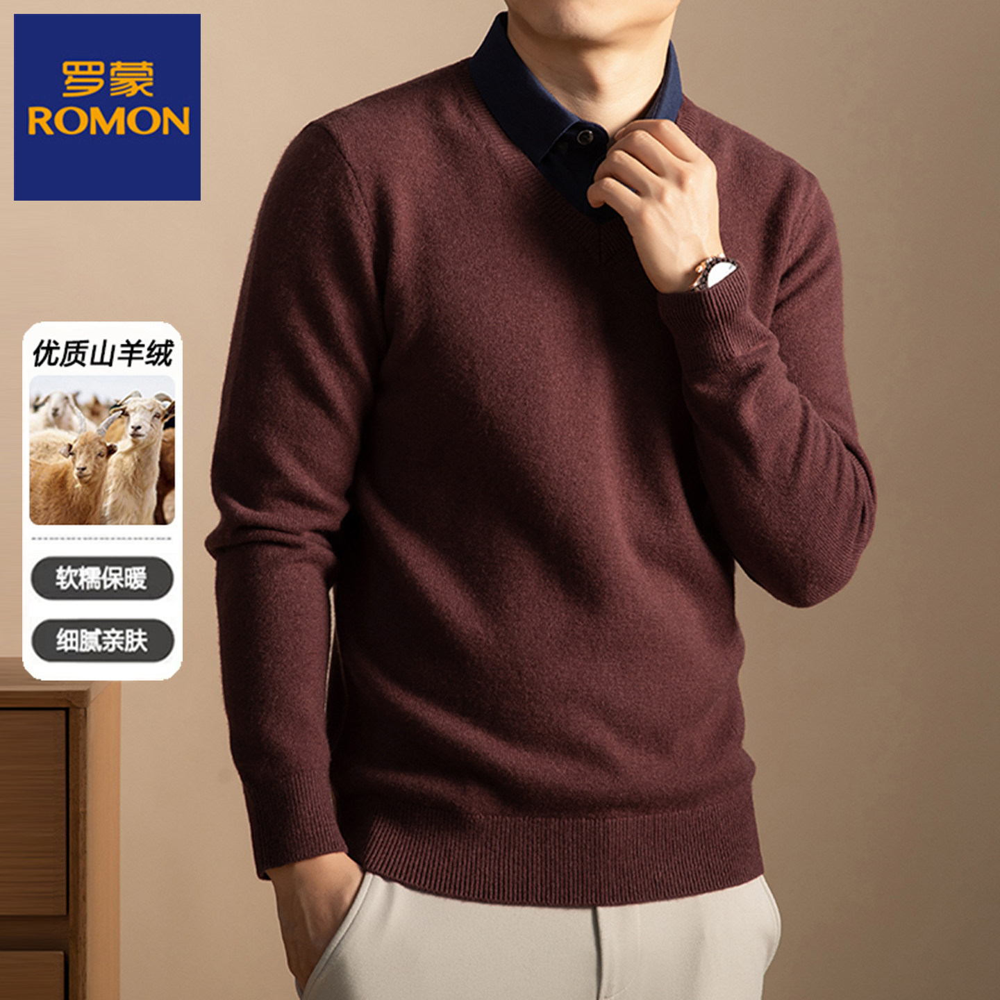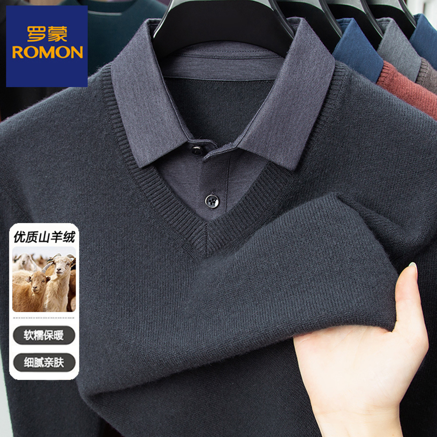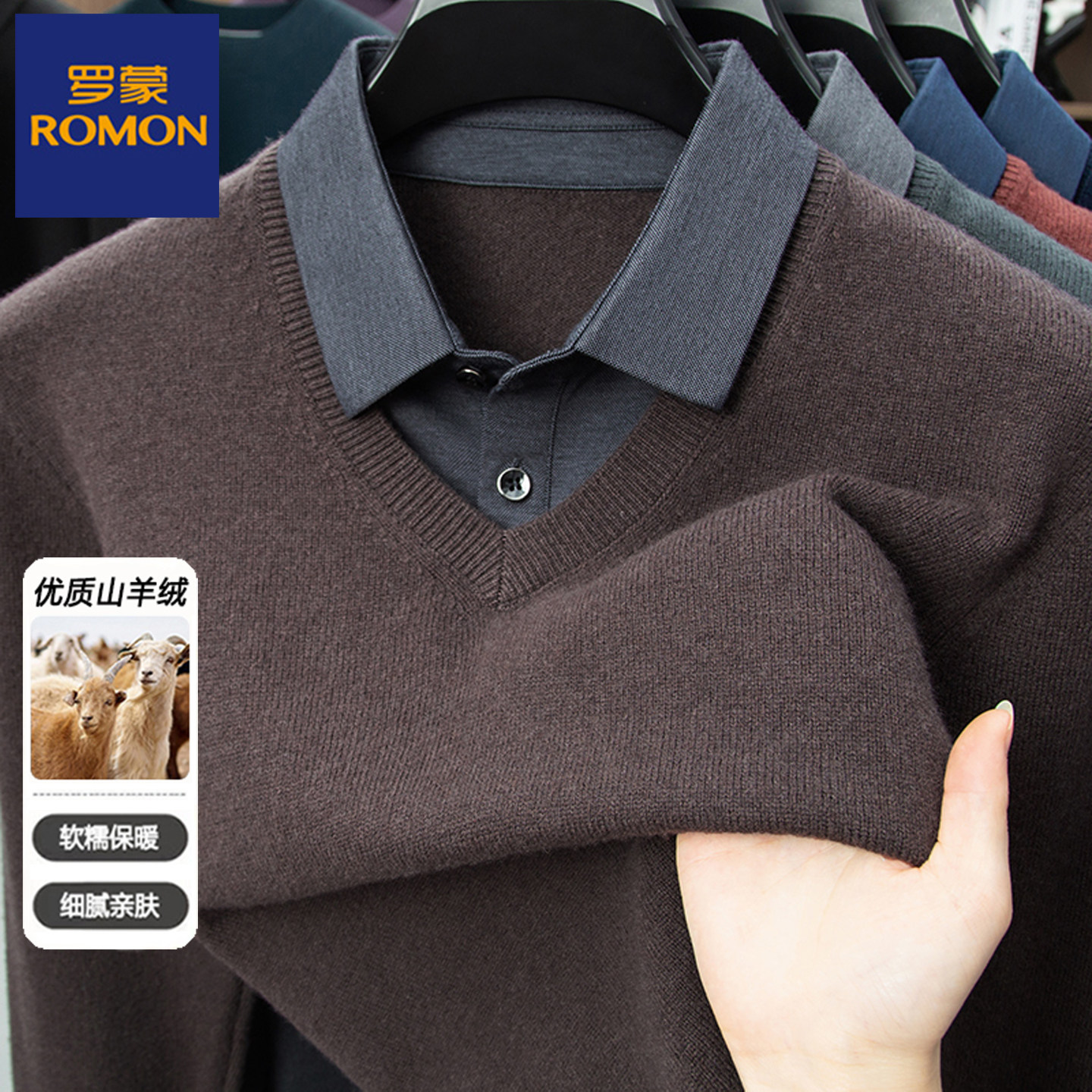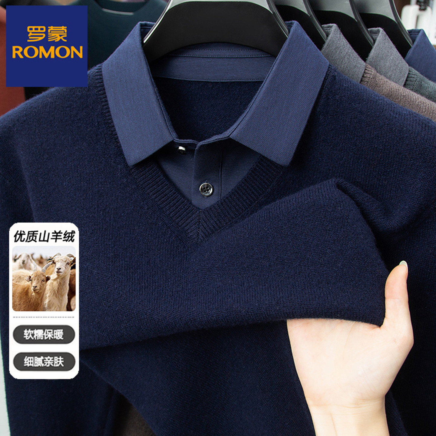 淘宝罗蒙男装秋冬厚款男士纯羊绒针织衫中老年爸爸装衬衫领假两件毛衣