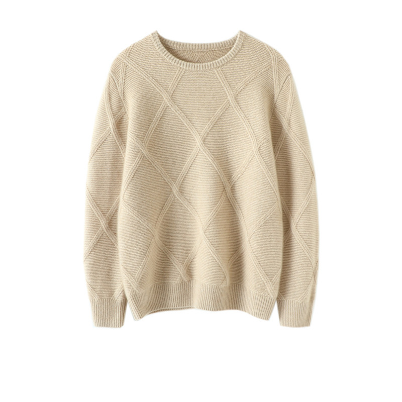 本期力荐!全新男士100%山羊绒圆领毛衣,甄选优质纯羊绒材质,触感柔软细腻,亲肤保暖,轻盈不压身。经典圆领设计简约大方,搭配立体菱形格纹理,彰显低调雅致品味。加厚针织工艺提升保暖性能,适合秋冬日常通勤或休闲穿搭。版型修身有型,不显臃肿,轻松打造儒雅绅士风范。无论是单穿还是内搭,都能展现高级质感。精工细作,品质出众,是男士衣橱不可或缺的温暖之选。这个秋冬,穿上它,温暖与风度并存,尽显成熟男性魅力。