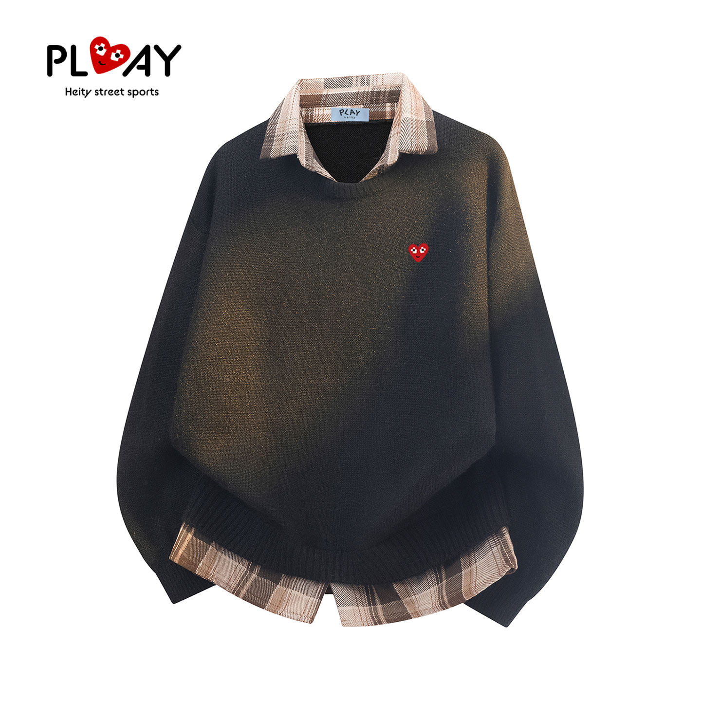 淘宝PLAY HEITY 官方潮牌假两件针织衫男女宽松衬衫领百搭情侣款毛衣