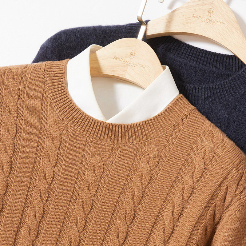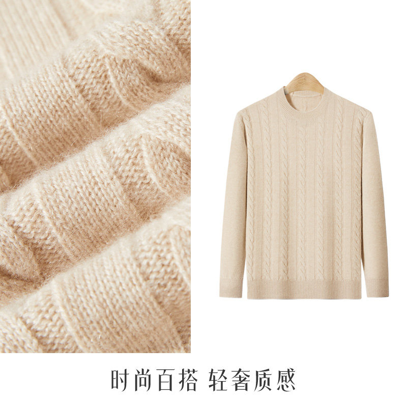 天猫春竹冬新款100%山羊绒绞花圆领男套衫舒适针织毛衣上衣男
