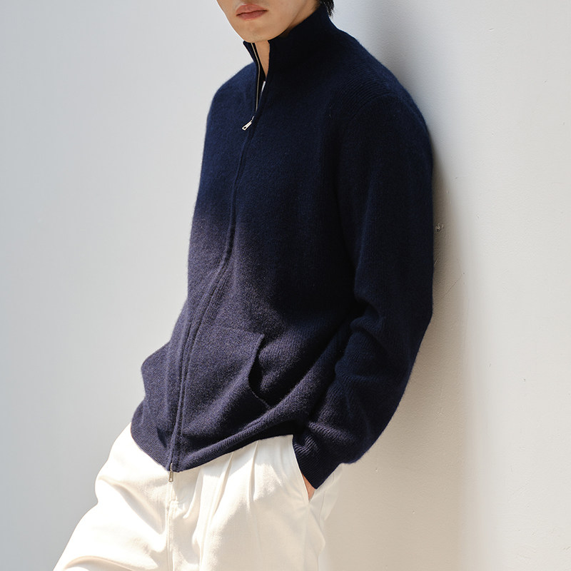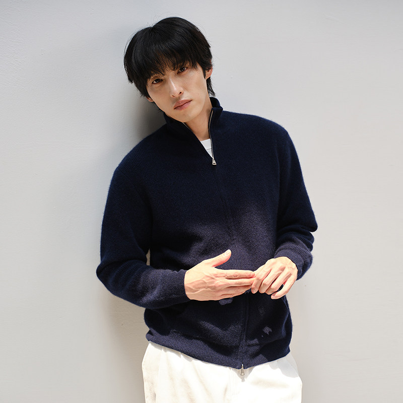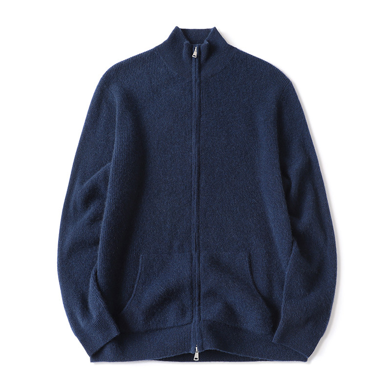 天猫思诺芙德立领厚款双拉链山羊绒男款开衫25秋冬新款蓝色针织外套