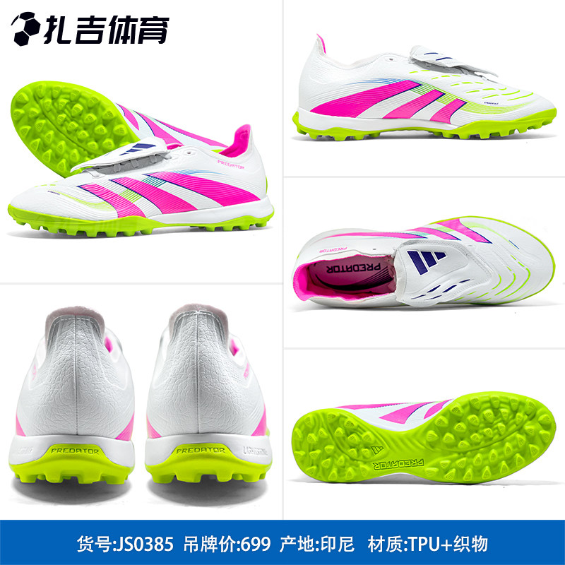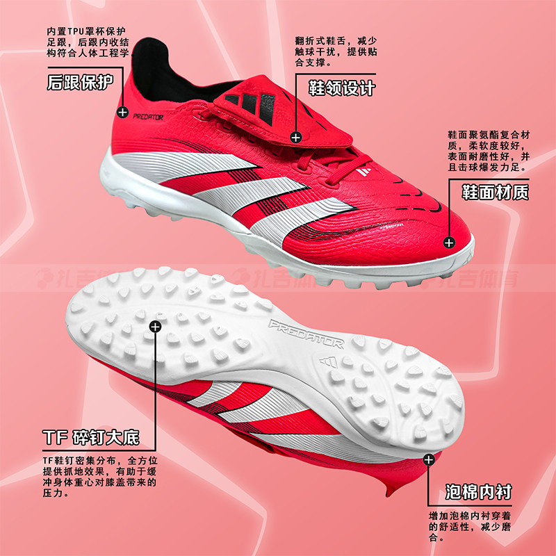 扎吉体育推出的阿迪达斯PREDATOR TF碎钉足球鞋(型号JQ1072/JS0385)是一款专为人工草场地设计的中端实战鞋款。延续PREDATOR系列经典血统,鞋面采用合成革材质,搭配立体摩擦条设计,有效提升控球与传球精准度。TF碎钉大底提供出色的抓地力与稳定性,适应多种人造草场地。中底缓震科技确保长时间运动舒适,鞋型贴合脚型,兼顾包裹性与灵活性。整体设计简约动感,适合业余爱好者及校园球员日常训练与比赛穿着。性价比高,是追求性能与实用兼备的理想选择,助力球员在场上自信发挥。