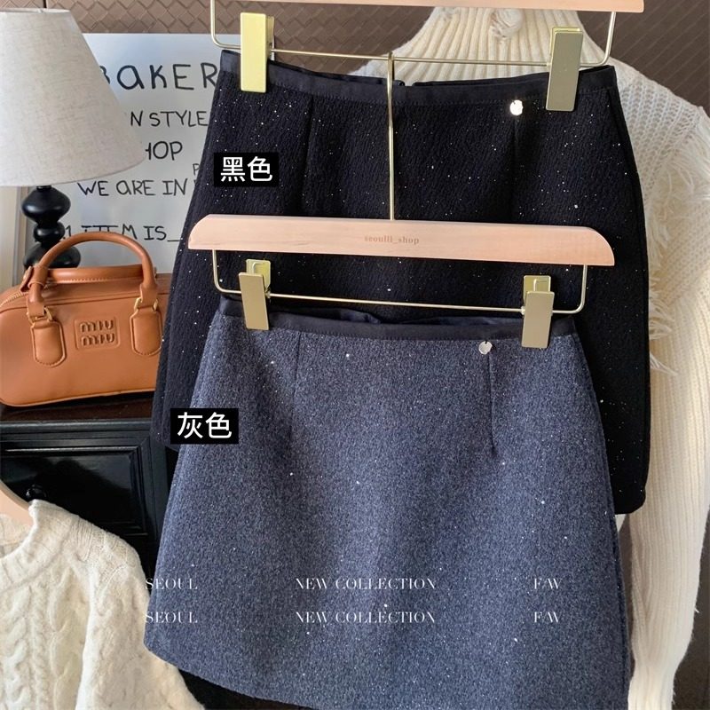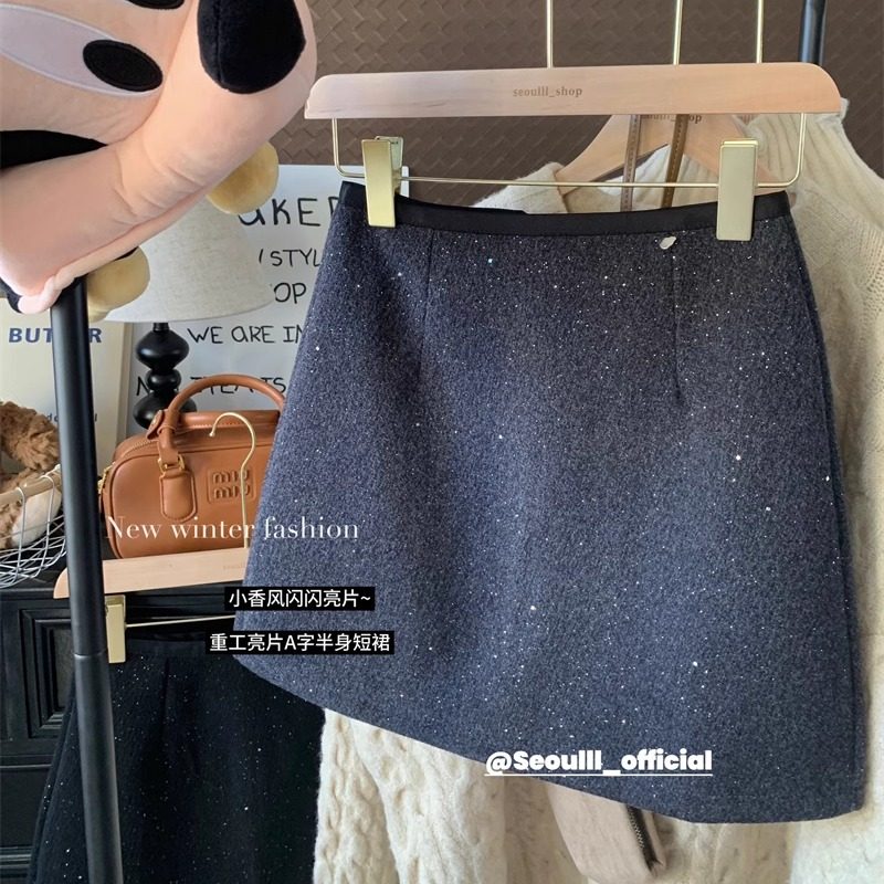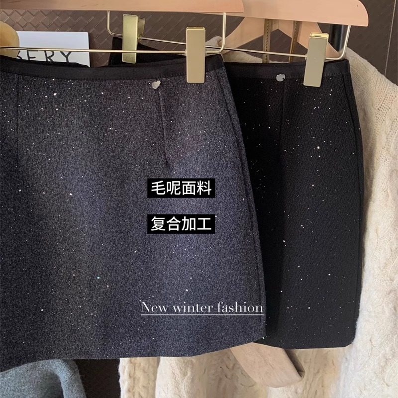淘秋冬新款韩系穿搭半身裙女钉珠亮片a字裙高腰显瘦毛呢包臀裙短裙