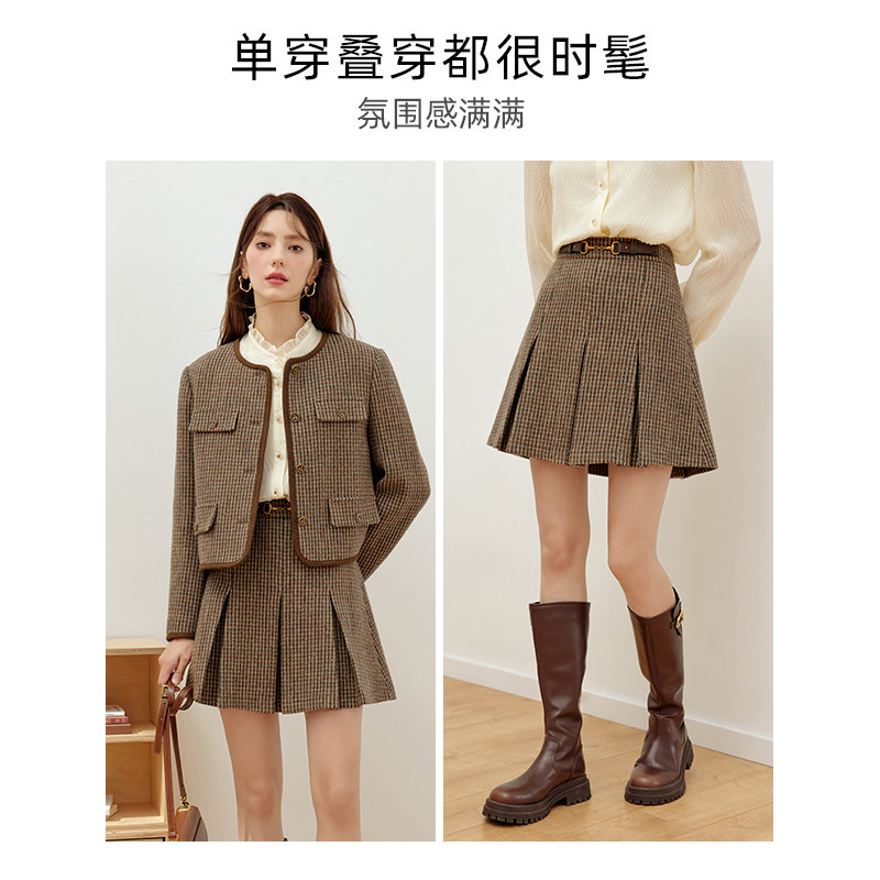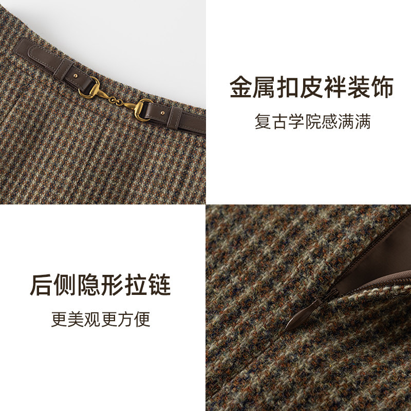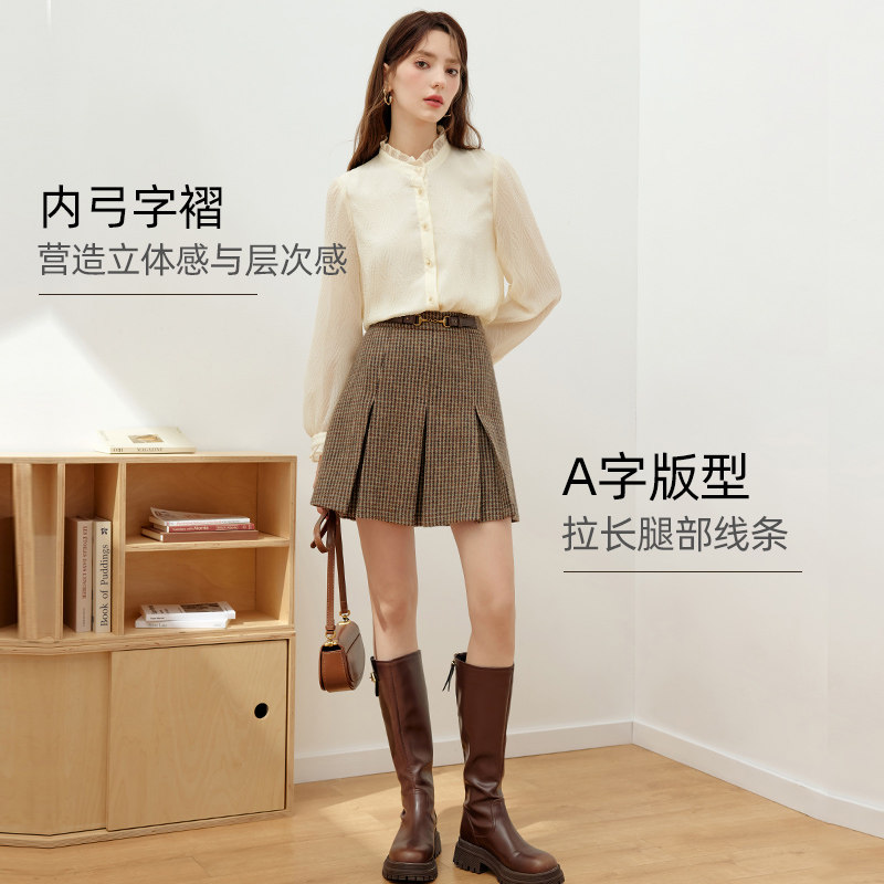 淘宝KBNE咖色千鸟格半身裙女短裙新款气质秋冬装百褶裙A字裙包臀裙