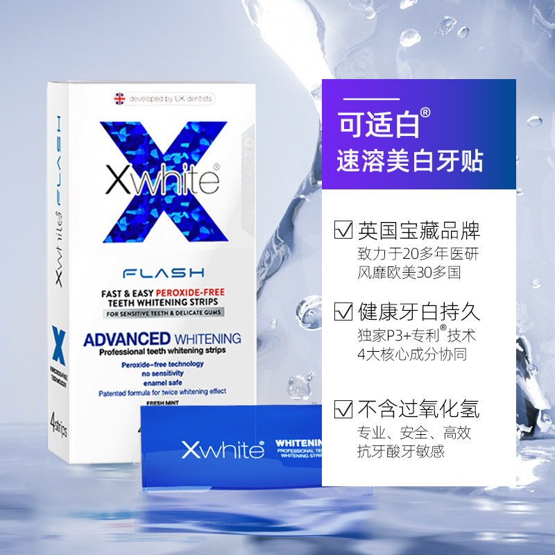 英国进口可适白Xwhite闪白牙贴,专为追求高效亮白人士设计,2对装满足完整美白周期。采用创新全溶技术,贴合牙齿表面,温和分解深层色素,有效去除咖啡、茶渍、烟渍等导致的牙黄问题。无需牙医操作,居家即可轻松使用,15分钟快速见效,持续使用显著提升牙齿亮白度。材质柔软舒适,贴合度高,不刺激牙龈,适合敏感牙齿人群。作为“懒人神器”,每天一贴,省时省力,助你轻松拥有自信笑容。安全认证,品质可靠,是英国广受欢迎的美白牙贴品牌,让亮白牙齿触手可及。