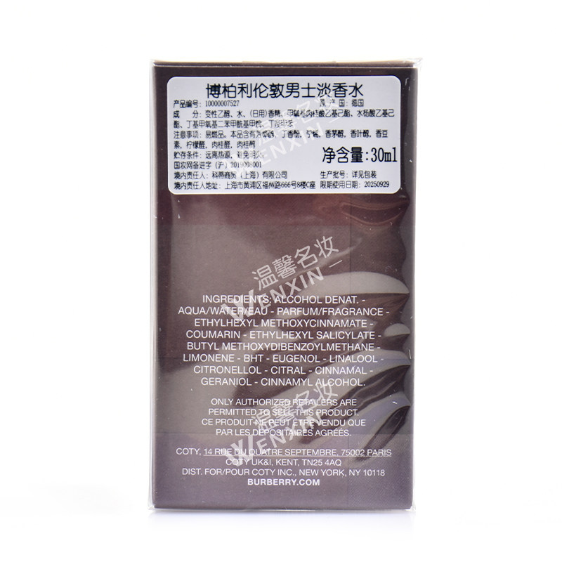 BURBERRY博柏利新伦敦布格男士女士淡香水,以经典品牌信誉及时尚品味打造的精品香水。这款香水融合了浓郁的英伦风情与优雅的气息,其独特的香气结合了多种珍稀花卉和天然植物精华,营造出令人难以忘怀的香氛体验。瓶身设计简洁大方,透露出浓厚的现代气息。新伦敦布格男士女士淡香水不仅有清新的香味,同时还有浓郁版供您选择,不论选择哪款都能让人心情愉悦,活力四溢。此香水特别适合情人节使用,适合各种场合的特别赠礼。它的美妙芬芳能够表达对他或她的深情关怀与珍视之意。香水净含量为浓香版高达30ml或大容量版本所达到的用量也非常超值。