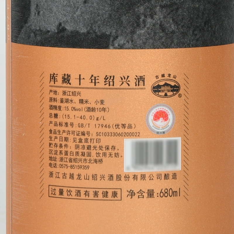 古越龙山绍兴黄酒中央库藏十年680ml*6瓶装半干型绍兴酒无焦糖色