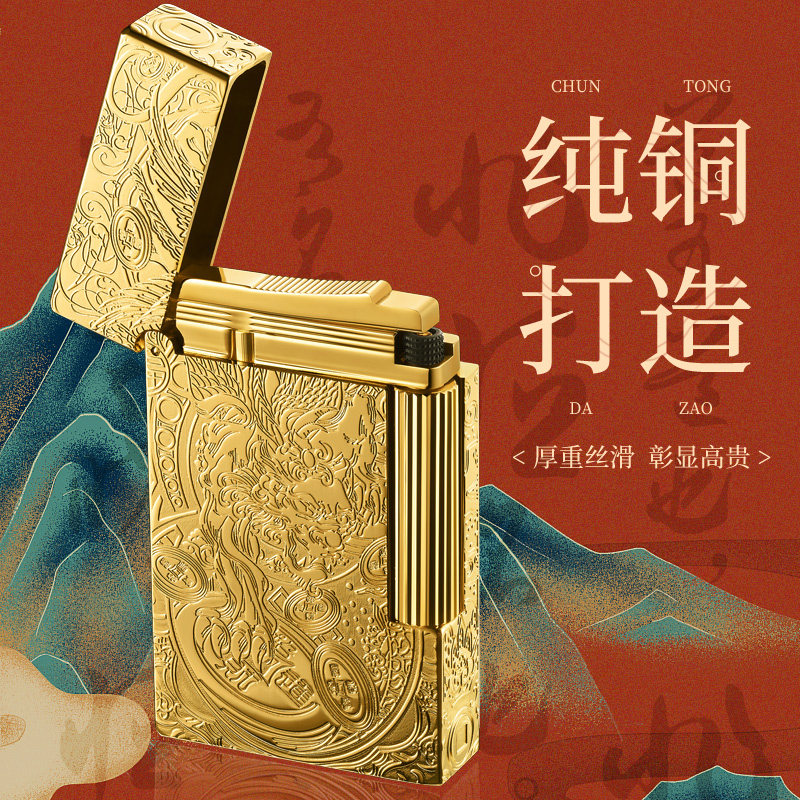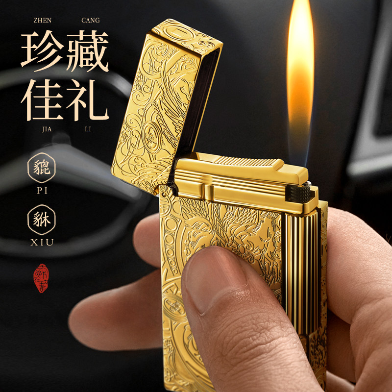 天猫法国神骏男商务高档朗声打火机明火充气复古雕刻貔貅纯黄铜送男友