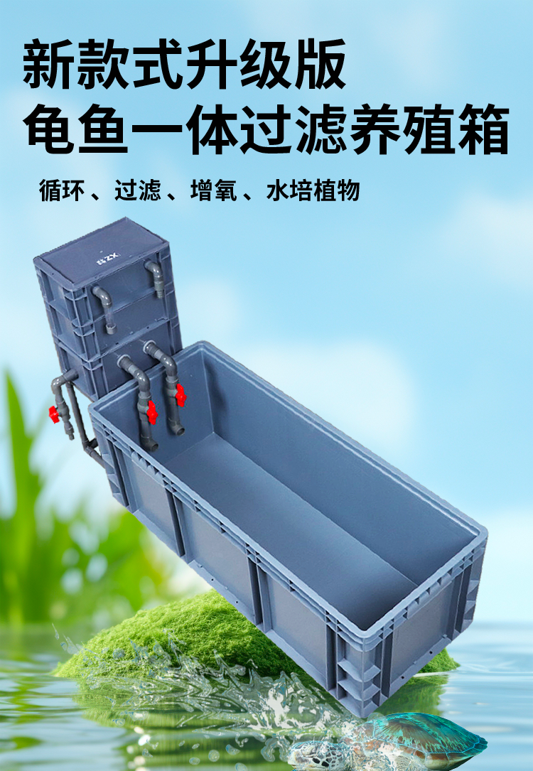 这款龟鱼一体养殖箱集过滤、排污、增氧等多功能于一体,专为养龟爱好者设计。箱体采用高强度环保材料,耐用且安全无毒,支持龟与小型鱼类混养,生态更自然。内置高效过滤系统,有效净化水质,配合底部排污口,轻松清理残饵粪便,保持水体清洁。配备增氧装置,提升溶氧量,保障龟鱼健康生长。附带稳固支架,摆放平稳,节省空间。适用于家庭、阳台或庭院使用,既是实用周转箱,也是美观生态缸,兼顾观赏性与功能性,是养龟新手与资深玩家的理想选择。