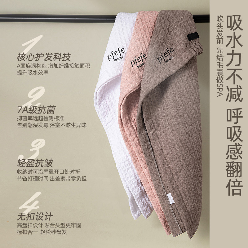 PFEFE珀法瑞美国黑科技浴帽是一款集超强吸水与速干功能于一体的创新干发帽。采用美国进口高科技超细纤维材质,吸水性能高达普通毛巾的5倍以上,能快速锁住水分,大幅缩短头发晾干时间。轻盈透气、亲肤柔软,佩戴舒适不紧绷,有效减少摩擦损伤。独特包头设计贴合头型,防滑不脱落,洗头后轻松包裹,解放双手。适用于居家、旅行、健身房等多种场景,是追求高效护发的理想选择。PFEFE珀法瑞以科技赋能日常护理,让干发更快捷、更省心,开启智能洗护新体验。