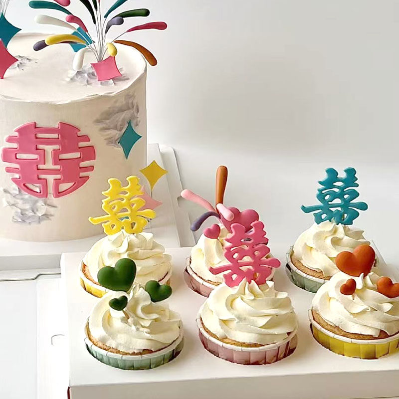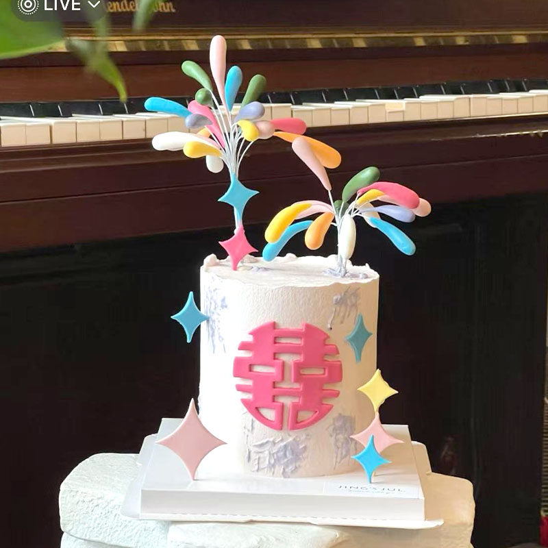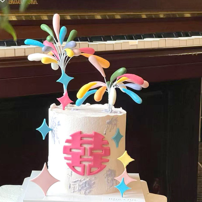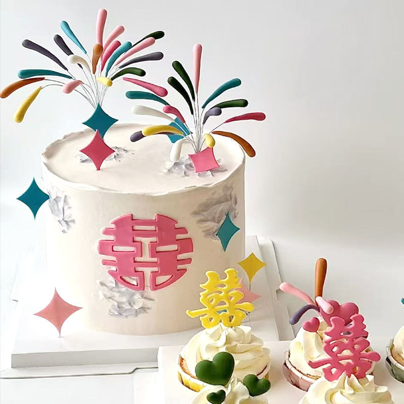 淘宝多巴胺结婚订婚蛋糕甜品台彩色喜字翻糖模具礼花插件装饰烘焙蛋糕
