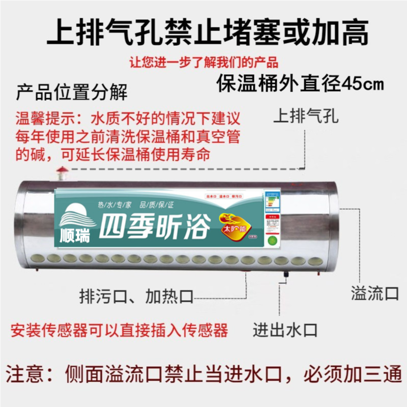 四季全不锈钢太阳能热水器采用高品质304不锈钢内胆,耐腐蚀、抗压性强,确保长久使用寿命。配备高效紫金管集热技术,吸热效率更高,即使在阴天或冬季也能稳定集热。支持光电两用功能,阳光不足时可自动切换电辅助加热,全天候保障热水供应。智能自动上水系统,精准控制水位,避免溢水或干烧,使用更安心。整机采用全不锈钢材质,防锈耐用,适应各种恶劣天气。安装简便,节能省电,是家庭、酒店等场所的理想热水解决方案,真正实现环保、安全、舒适的热水体验。