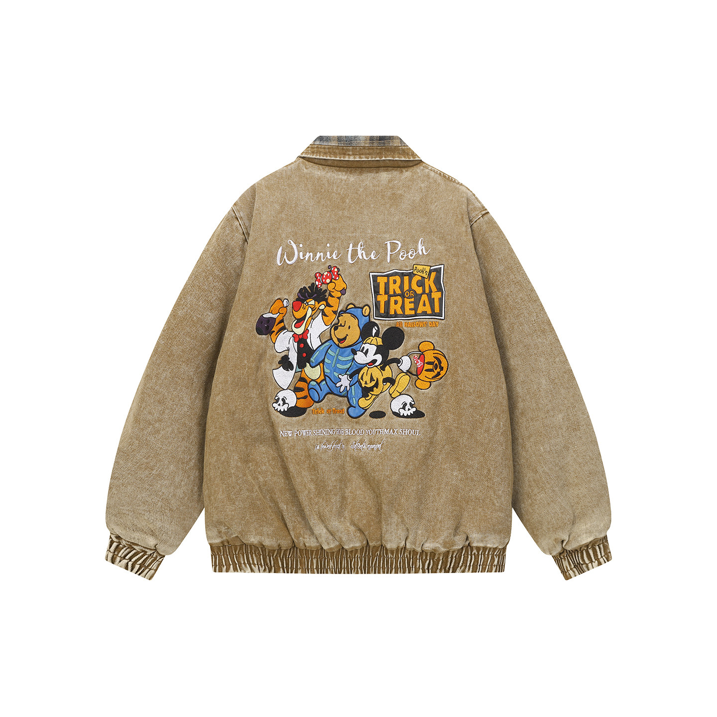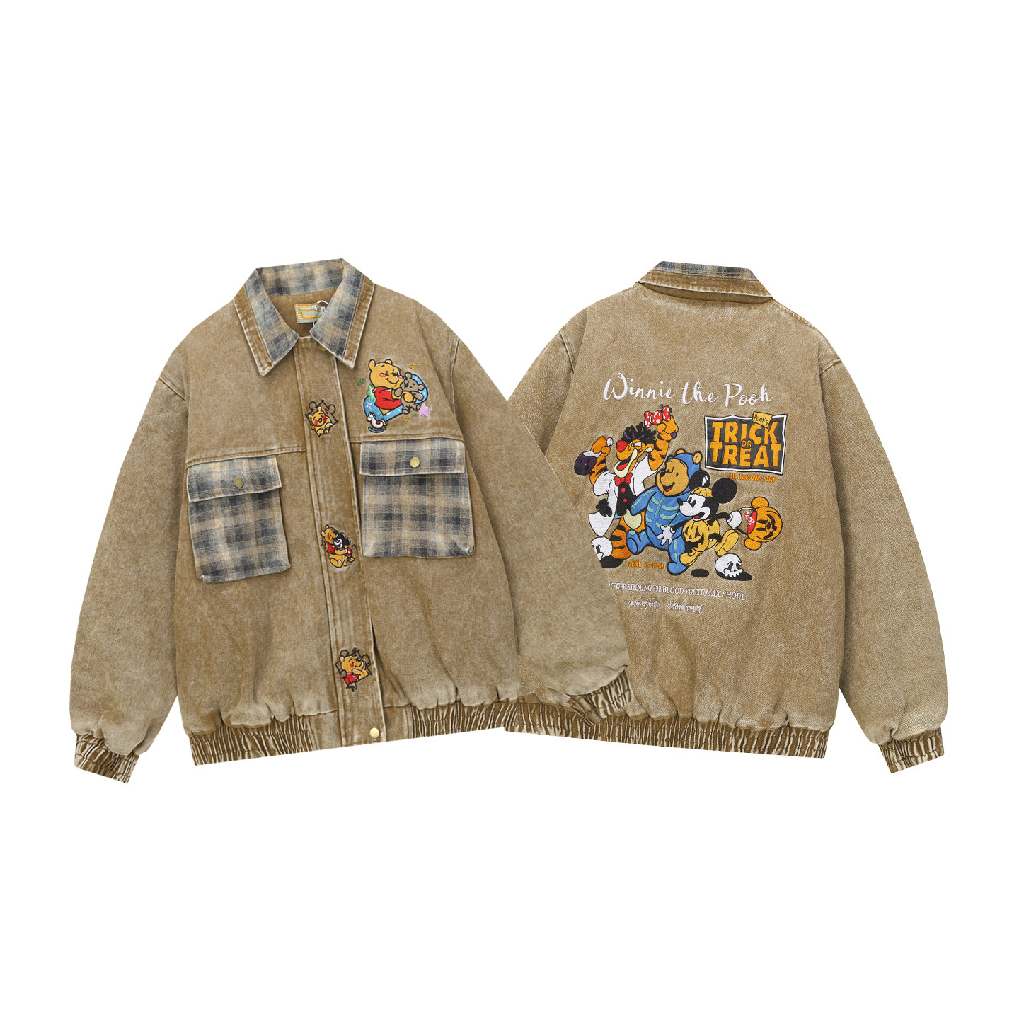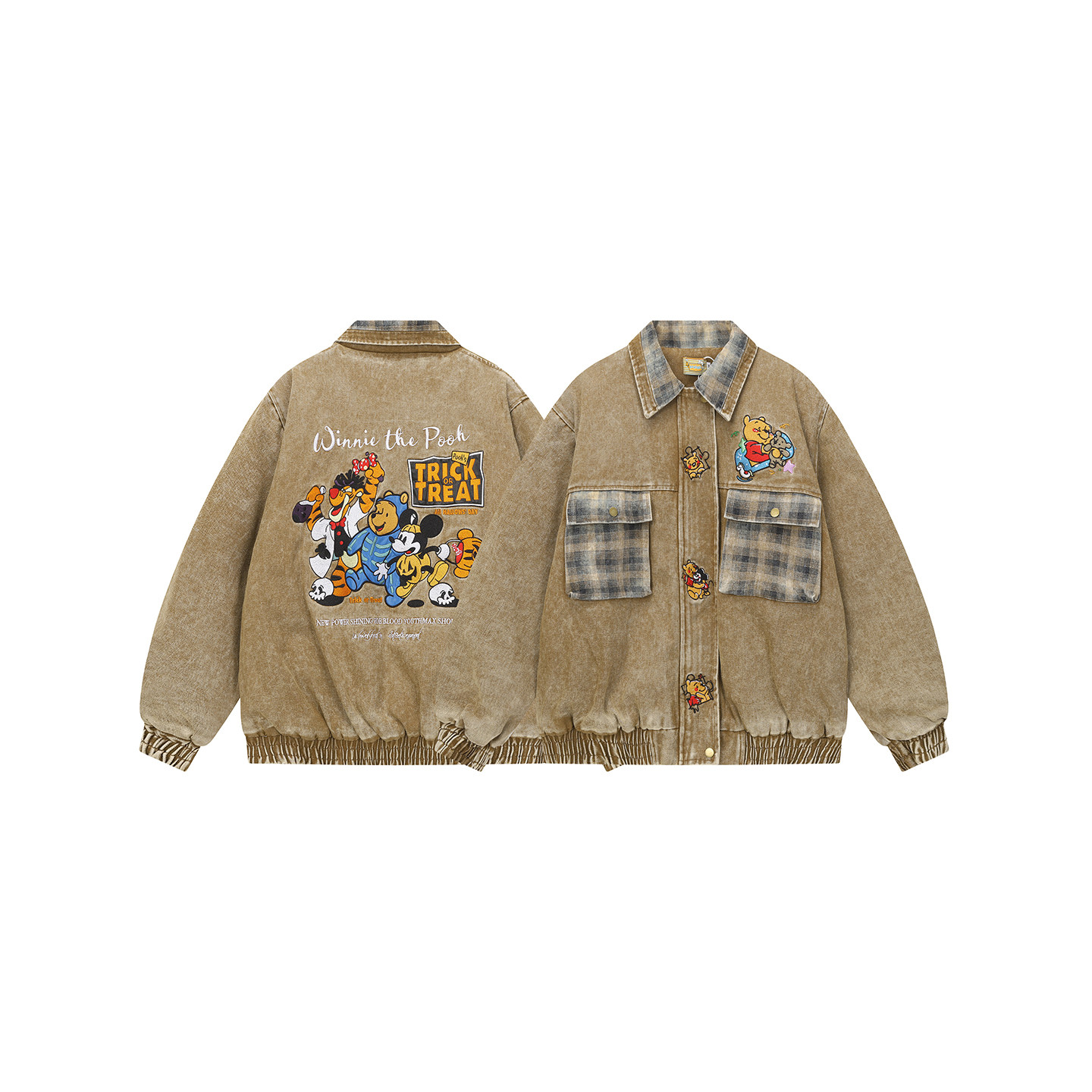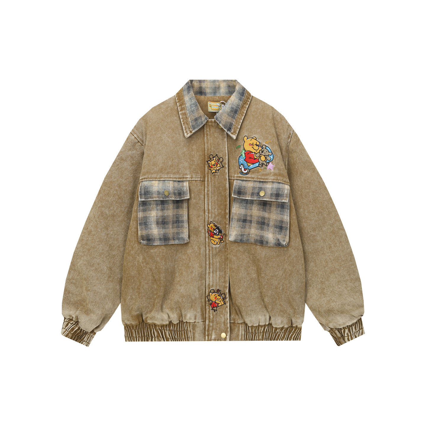 淘宝美式复古拼格子卡通刺绣翻领棉衣男女宽松百搭加厚牛仔外套